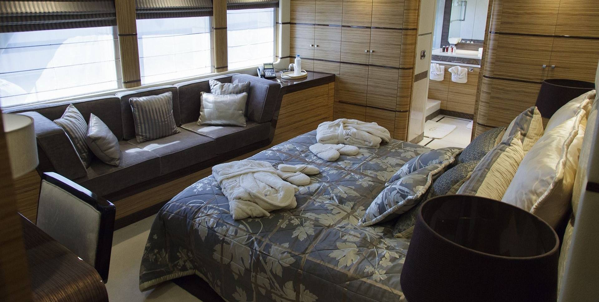 I SEA’s layout sleeps up to 10 guests in 5 comfortable cabins: master suite on the upper deck, 2 Double bed guest cabins on the main deck , 2 Twin bed guest cabins on the lower deck. The master suite is complete with a large bathroom, walk-in wardrobe, a private salon, and a balcony that allows spectacular panoramic views.