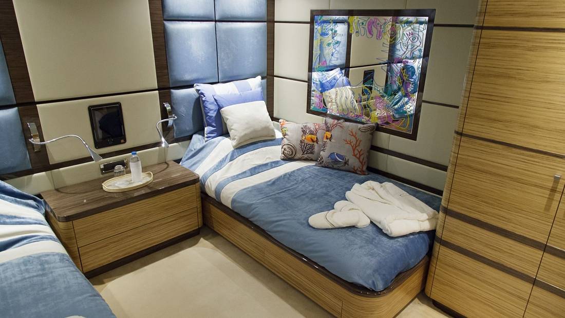 I SEA’s layout sleeps up to 10 guests in 5 comfortable cabins: master suite on the upper deck, 2 Double bed guest cabins on the main deck , 2 Twin bed guest cabins on the lower deck. The master suite is complete with a large bathroom, walk-in wardrobe, a private salon, and a balcony that allows spectacular panoramic views.