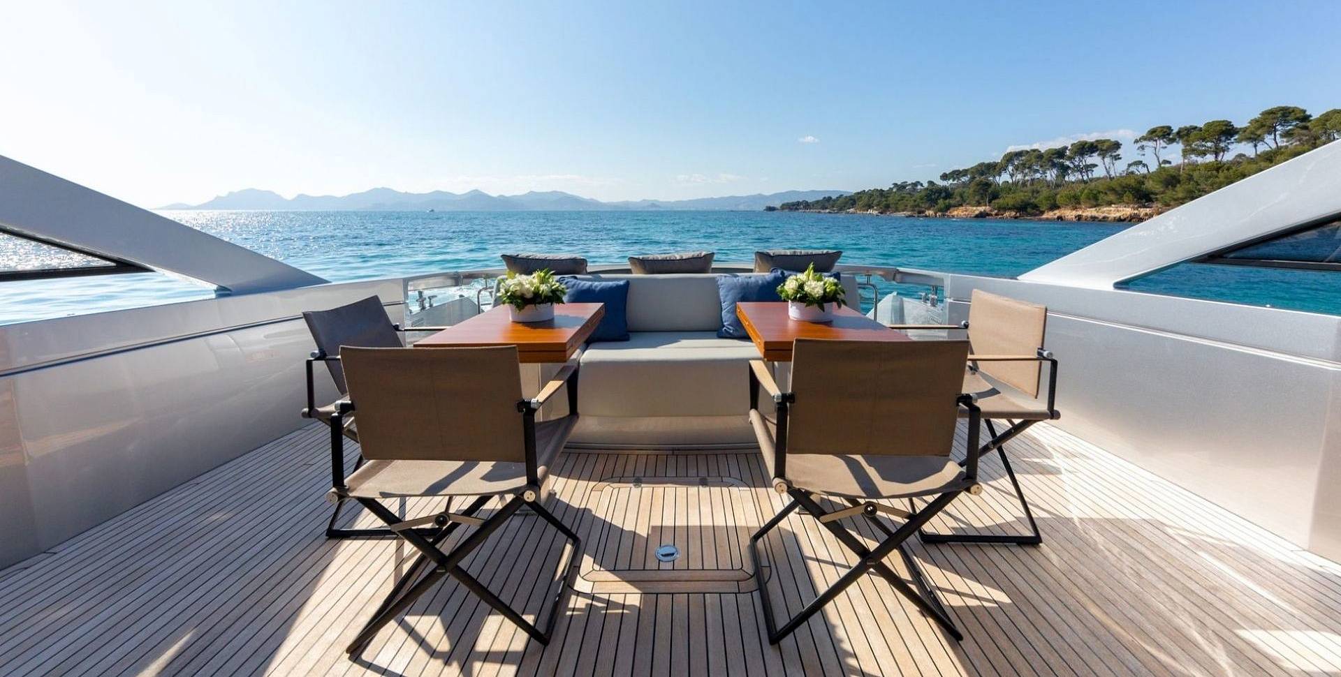 The super cozy dining and sunbathing areas welcome guests in the cockpit. Going further, to the main salon, you’ll see a spacious room with plenty of seats, a pop-up TV, helm station, and, of course, large panoramic windows with a sunroof.