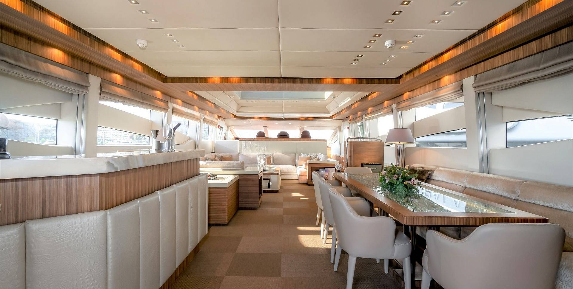 Contemporary interior, designed by Studio Vafiadis, includes fine woods, leather and high quality fabrics. She recently underwent a refit and now features new deck teak, carpets, linens and blinds, plus, upgraded water toys.