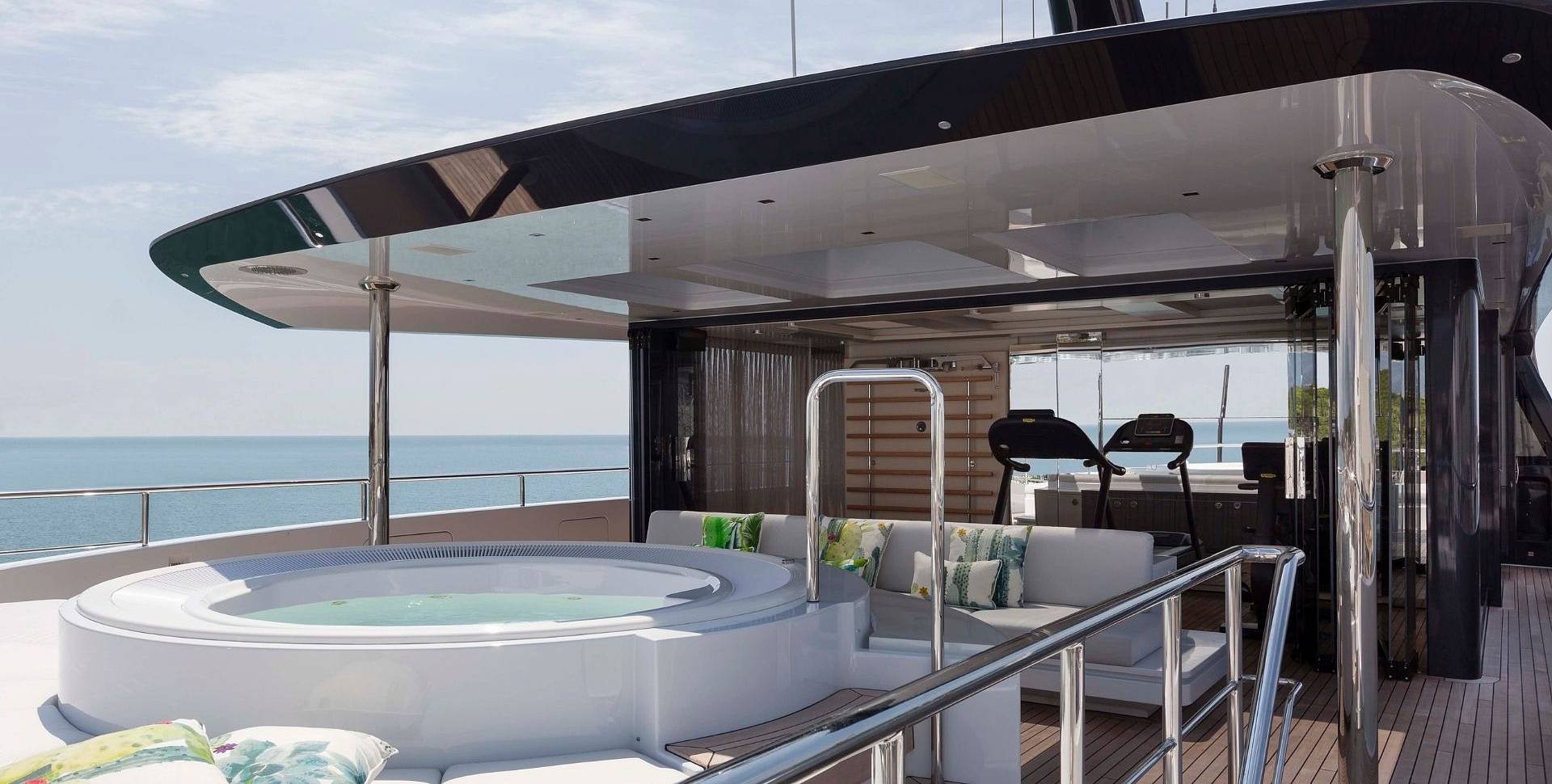 The most notable highlights of the yacht are her large outdoor spaces and spacious interiors. An enormous beach club is the first thing guests see while stepping on board QUINTA ESSENTIA. The main deck aft has a wide seating area overlooking a stunning pool with a waterfall. The aft upper deck boasts ideal space for outdoor parties. The sundeck features a spacious state-of-the-art gym with floor to ceiling windows and an outdoor Jacuzzi lounge area.