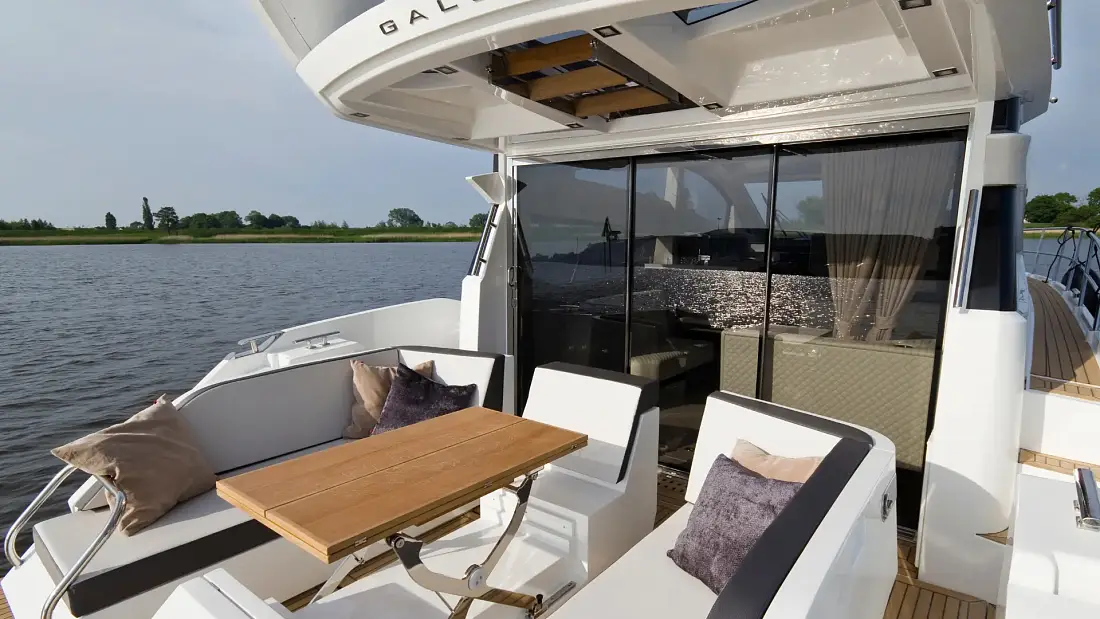 The Galeon 430 Skydeck model marks the new generation of Galeon yachts with a refreshing top deck design that combines the benefits of both the flybridge and hardtop versions. Find three forward facing seats and two sundecks on top all while maintaining a distinguishable and sleek look of the Galeon 430 Skydeck yacht.A wide sunroof opens over the helmsman station while an automatic, drop down ladder allows easy access to the top, without compromising any of the cockpit space. The modular aft design of the Galeon 430 Skydeck will enable to effortlessly transform from a sundeck into separate loungers or a dinette with a pop-up table. The extended hydraulic stern platform will be appreciated by all water paraphernalia enthusiasts.