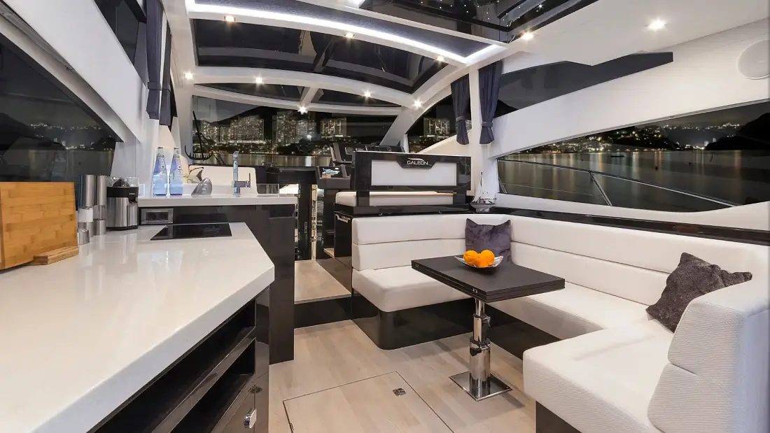 The main deck on board Galeon 430 Skydeck offers a well-planned and meticulously finished interior with a sizeable dinette, a galley and an elevated helmsman station. Down below, three cabins and two bathrooms ensure privacy and comfort for all passengers. The port side cabin can be turned into a galley creating even more space on the Galeon 430 Skydeck yacht's main deck.