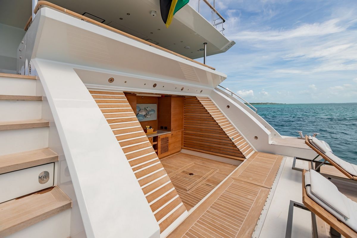 The aft deck boasts spacious seating, while the lounge aft features a round dining table, stylish seating, and an outdoor TV. The sundeck is an expansive haven with a glass and stainless observation bar, a full bar, and a 55” 360-degree rotation TV. Inspiration's bow features U-shaped seating, sunpads, and a Jacuzzi.