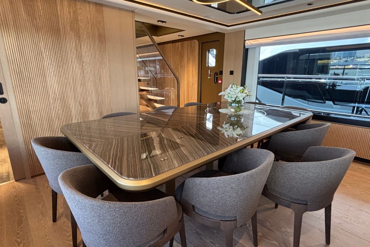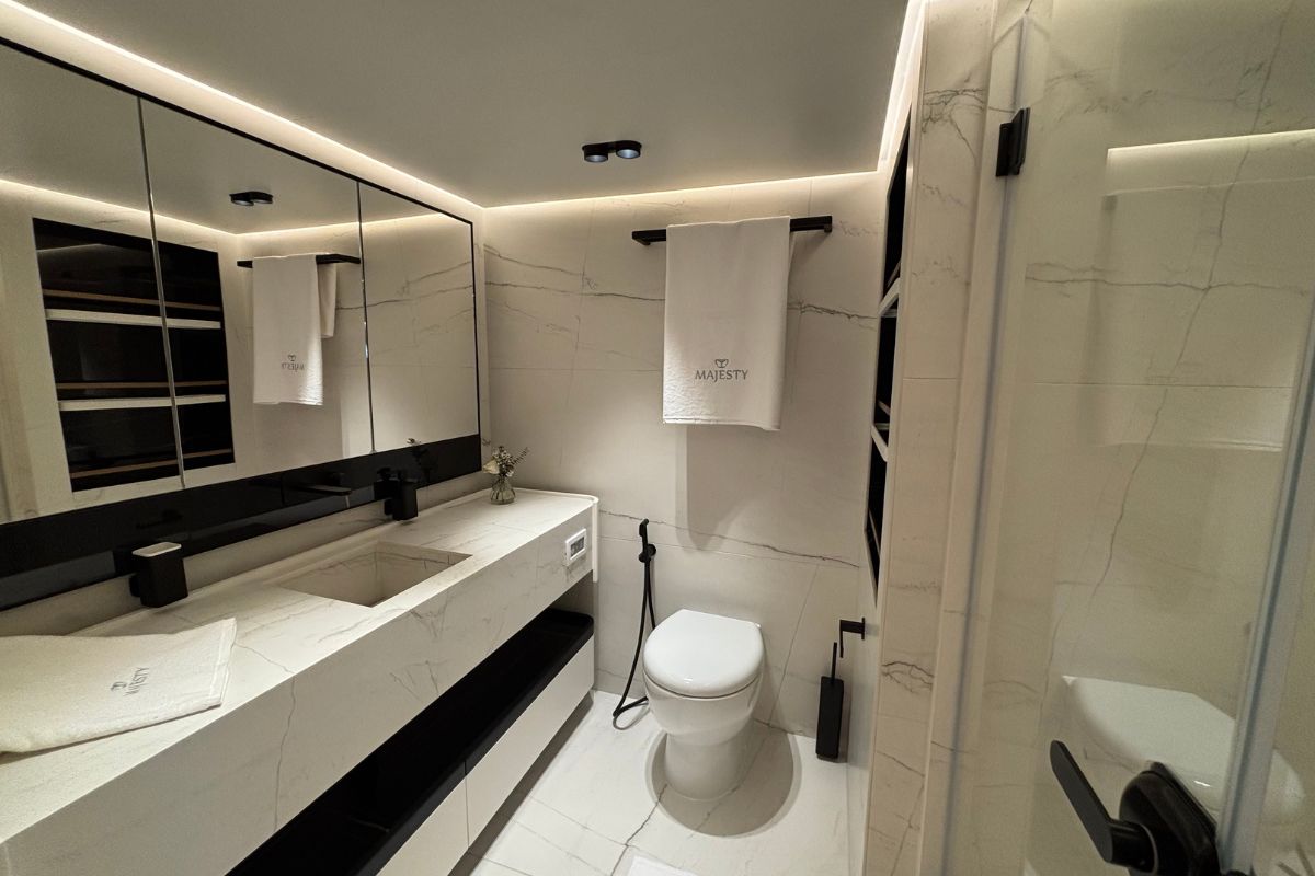 With privacy and comfort at the forefront, the Majesty 112 offers an asymmetric upper deck layout, providing an unobstructed guest experience. Her aft main deck spans over 30 square meters, creating a perfect setting for entertainment, complete with a glass balcony offering sweeping ocean views. The forward bow area of the Majesty 112 is equally impressive, featuring a jacuzzi integrated with stylish sunbeds.