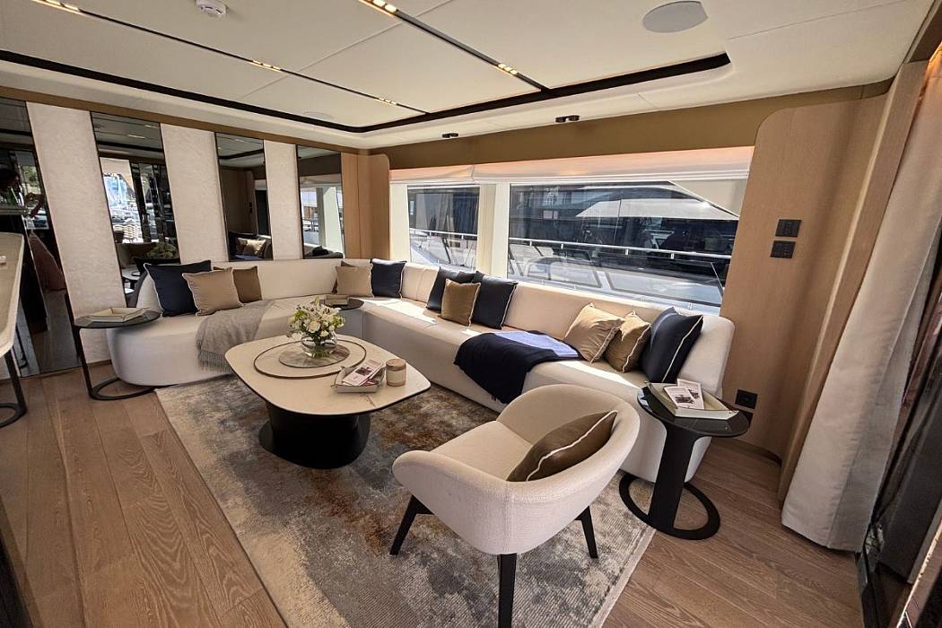 With privacy and comfort at the forefront, the Majesty 112 offers an asymmetric upper deck layout, providing an unobstructed guest experience. Her aft main deck spans over 30 square meters, creating a perfect setting for entertainment, complete with a glass balcony offering sweeping ocean views. The forward bow area of the Majesty 112 is equally impressive, featuring a jacuzzi integrated with stylish sunbeds.