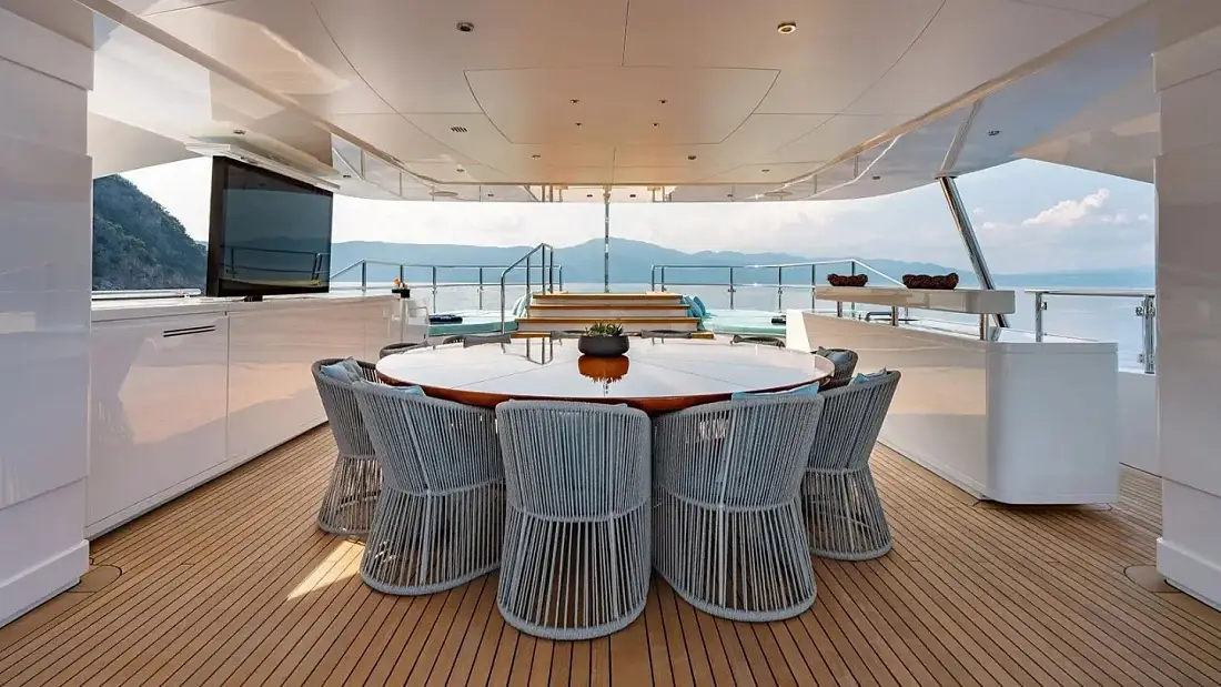 The yacht's exterior spaces include sundeck lounging areas, featuring multiple sun pads, sofas, and two pools. Additional seating on the main deck forward, coupled with shaded areas, enhances the outdoor experience.