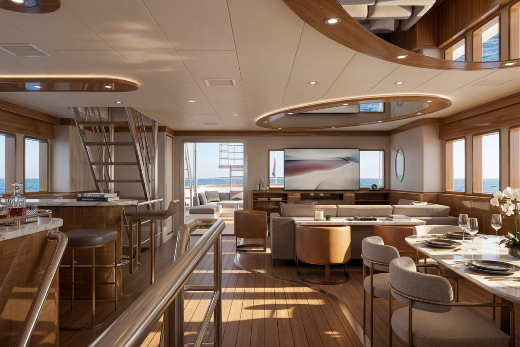 The propulsion package includes twin 750 HP engines, supported by a fuel capacity of 30,000 litres. At a cruising speed of 9 knots, the yacht is expected to achieve a range of approximately 4,500 nautical miles, allowing for long passages without the need for frequent refuelling. An additional feature is the possibility of silent cruising, reducing both noise and vibration on board.