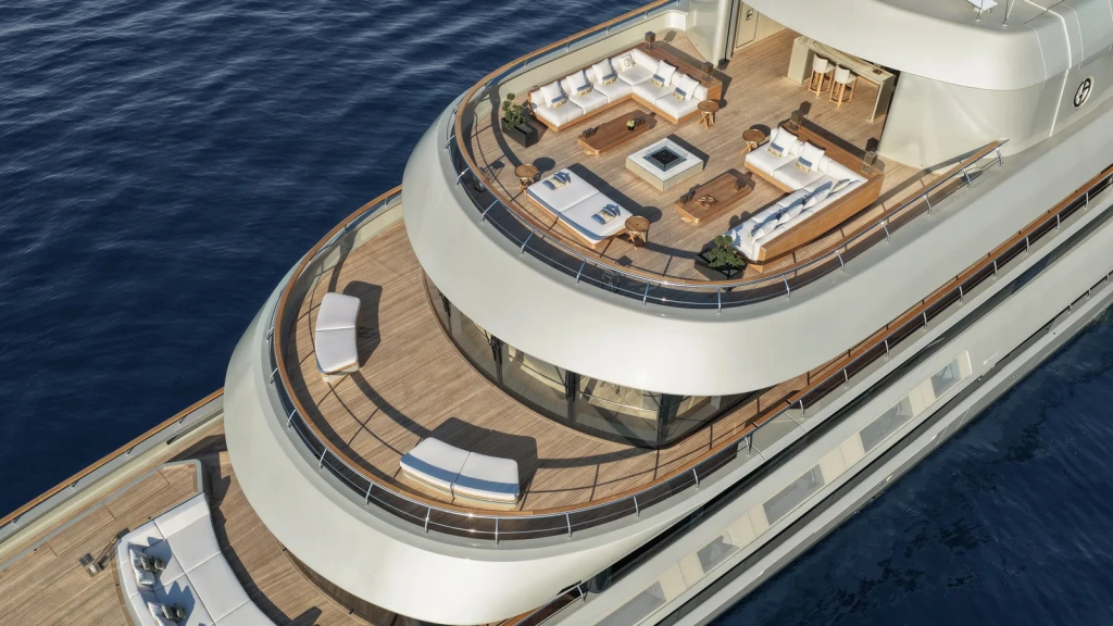 Her exterior avoids excess. A satin-gold profile defines the hull and superstructure, structured around precise geometric volumes softened by curved surfaces. Extensive floor-to-ceiling glazing opens the yacht visually, while the upper deck appears almost suspended, creating a terrace effect that lightens the yacht’s silhouette despite her displacement construction.