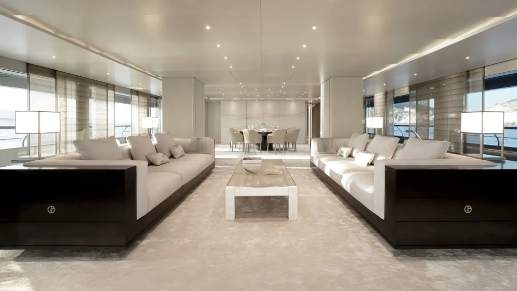 The main saloon serves as the social centre on board and a clear expression of Armani’s design discipline. An ivory onyx floor anchors the space, centred by a custom Armani Casa carpet. Canaletto walnut sofas are paired with coffee tables finished in platinum leaf, while a dining area forward seats 14 on Armani Casa “Lea” chairs. Decorative glass curtains—laminated glass with a metal-mesh core framed in champagne aluminium—were produced by three Italian specialists. A television remains hidden until lowered from the ceiling.