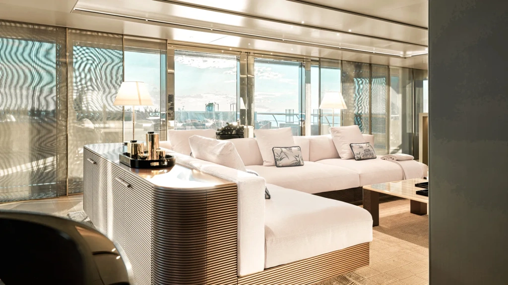 Guest accommodation is located primarily on the main deck. A forward VIP suite includes its own lounge, a Velvet Onyx-finished bathroom, and the ability to split into two separate cabins if required. Four additional guest cabins feature sliding beds that allow each to function as either a twin or double. En-suite bathrooms are finished in Azul Macaubas, Silk Georgette, or Taj Mahal quartzite, with Armani/Roca fittings selected to match the yacht’s champagne colour theme.
