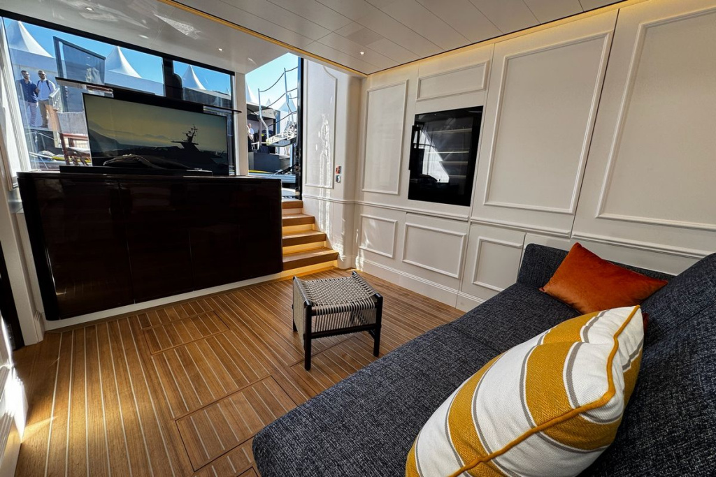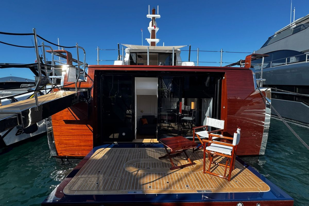 But it’s outside where the Picchiotti 24 makes her strongest statement. A fold-out sea terrace and one of the largest beach clubs in the 24-metre class create a true water-level living area.