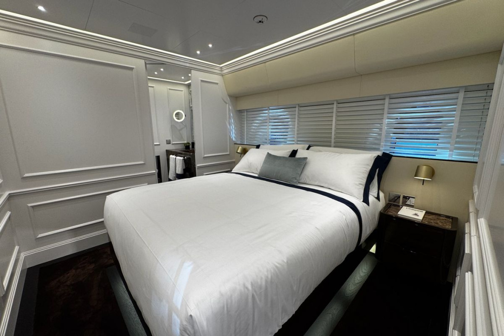 The yacht accommodates up to eight guests in three cabins, with separate crew quarters ensuring privacy on board. Interiors lean towards timeless simplicity, with light tones and clean detailing.