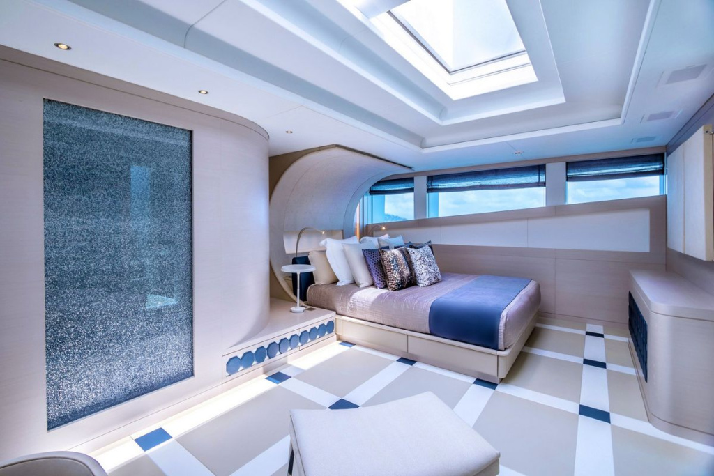 Inside, the yacht reflects the vision of Sandrine Melot of Richesse Intérieure. The main salon boasts panoramic windows, allowing sunlight to penetrate deep into the interior, highlighting bespoke elements such as Swarovski crystal accents and custom detailing.