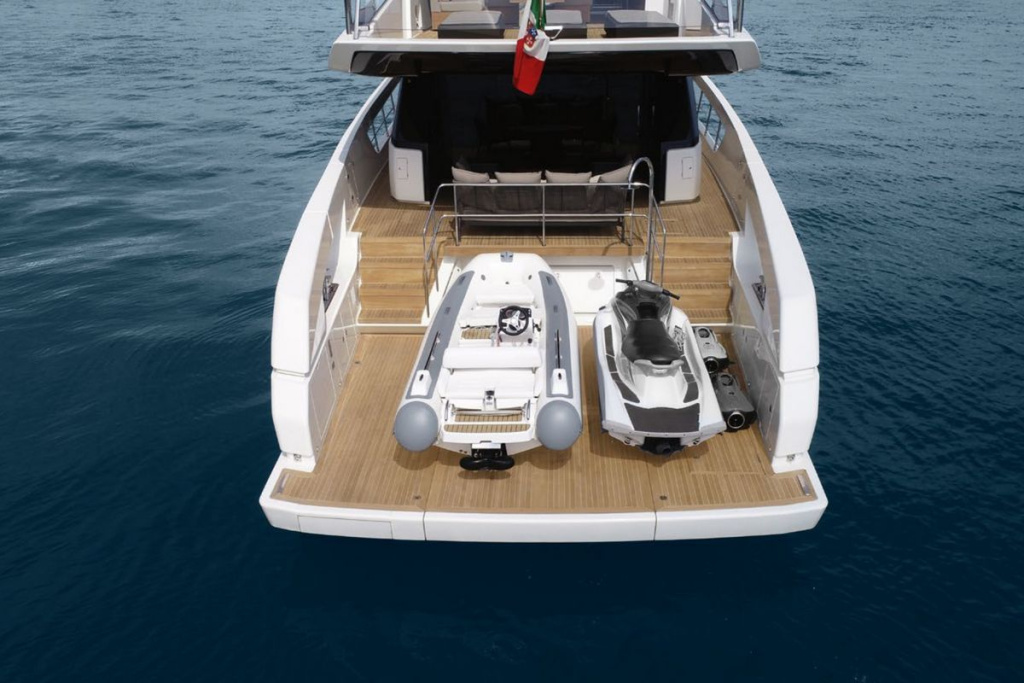 Space and volumes are optimized through smart space management. On the flybridge, the space is designed to be multifunctional: it converts into a climate-controlled panoramic lounge or an outdoor dining and relaxation area due to the fixed windscreen and sliding panels. At the bottom deck, the area dedicated to storing tenders and davit opens up into a generous 30 square metres beach club – the largest in its class.