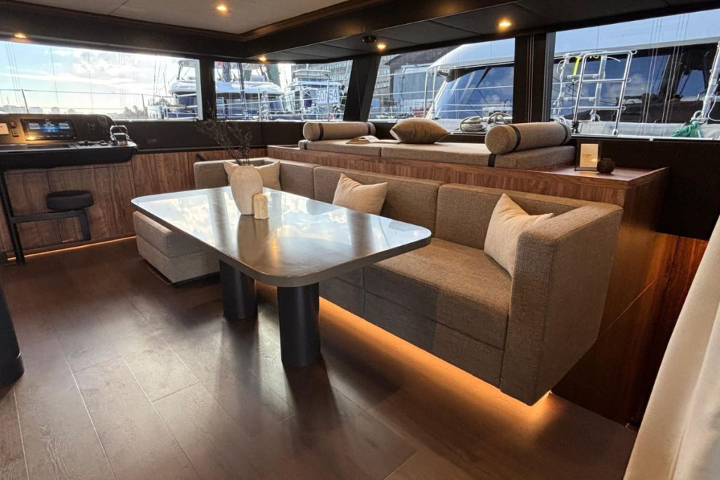 Her lacquered bright grey hull is a notable detail. This finish, combined with the black aluminium mast and boom, gives SOUL SURF a look that sets her apart from the typical white production catamaran. Teak decking across the cockpit, side decks and flybridge adds warmth and a traditional sailing feel to a thoroughly modern platform.
