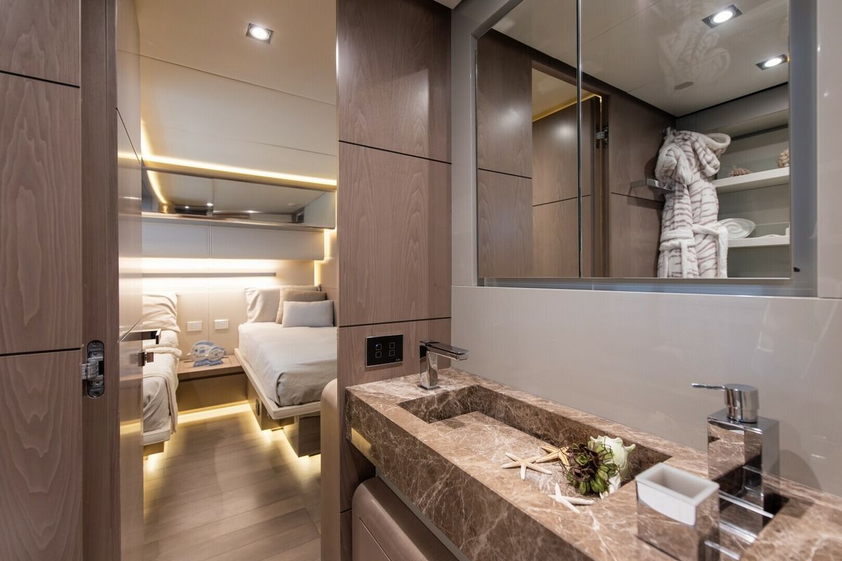 Delivered in 2015, 7 Seconds is a Dreamline 26 yacht built in GRP and designed by Enrico Gobbi’s Team for Design. She is equipped with CMC zero-speed stabilisers for stability underway and at anchor.Her internal volume is 140 GT, giving her a spacious interior layout rarely found on yachts of this size. 7 Seconds accommodates eight guests in four suites, each with a private bathroom and television. The crew quarters for three are located separately to ensure operational independence and guest privacy. The master suite, positioned forward on the main deck, features wrap-around glazing that provides a 180-degree sea view and opens directly onto a private foredeck lounge.