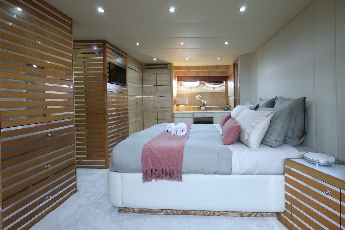 Measuring 27 meters, the Antago 90 offers spacious and well-lit interiors with panoramic windows on the main deck. The salon blends a comfortable lounge, formal dining area, and modern galley. The master cabin includes a king-size bed, lounge, and marble-finished en-suite bathroom. Her hull design supports smooth navigation, delivering high performance and stability. The Antago 90 combines style, comfort, and reliability, suited for those who expect quality and safety on board.