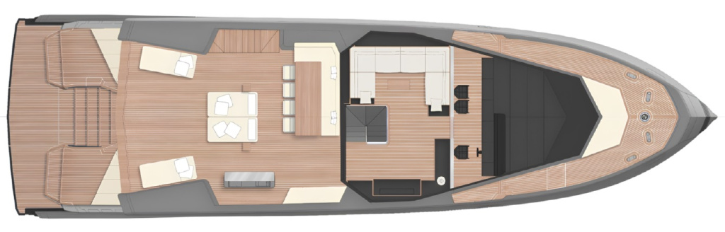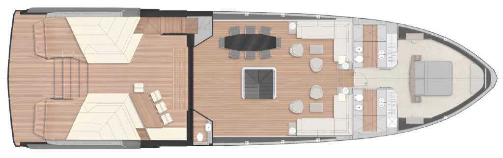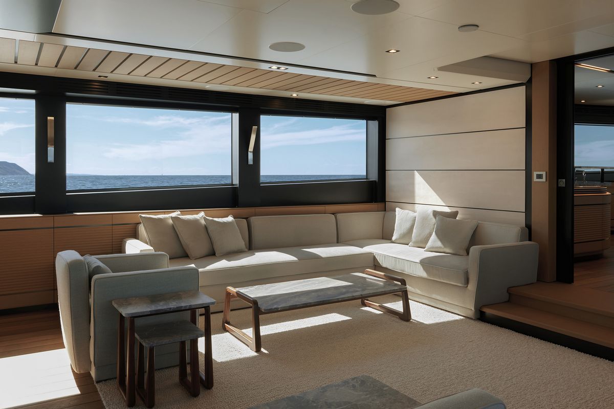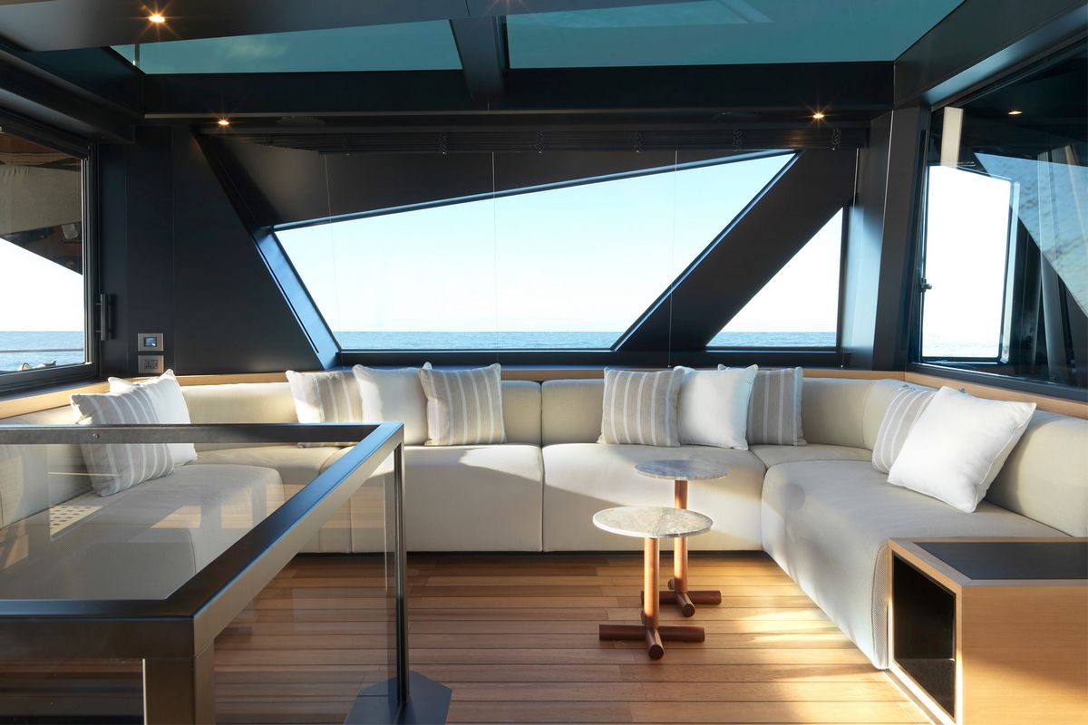 Carat features a 61-square-metre full-beam main salon, around 50% larger than salons in her class. This open-plan area is defined by a central carbon-fiber staircase that structurally links the lower deck accommodation to the upper deck sky lounge. A continuous band of vertical glazing surrounds the main deck, delivering abundant natural light and panoramic views.