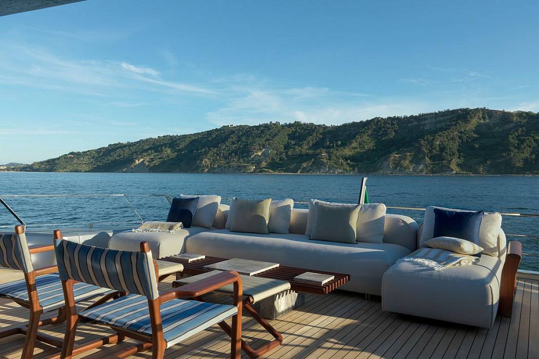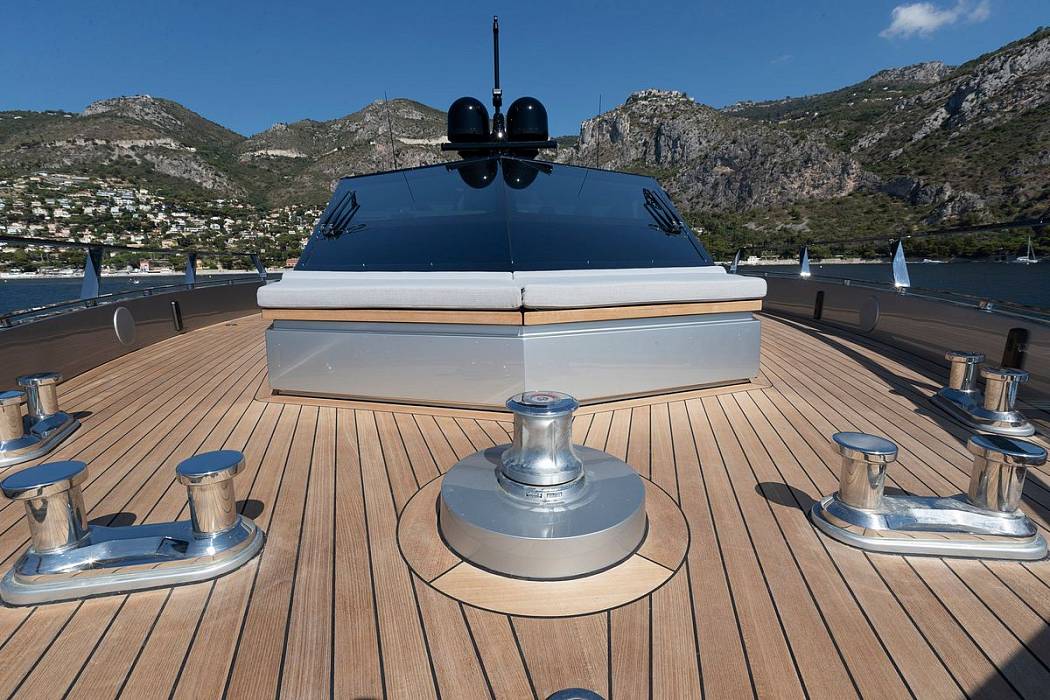 Outdoor areas of Carat include an upper aft deck with sun loungers and a shaded dining table, connected to an enclosed bridge via a large sliding door. Aft lower deck, fold-out wings expand the beach club to 32 square metres, providing sea access on three sides. Two concealed garages house a 3.95-metre Williams tender and additional water toys.