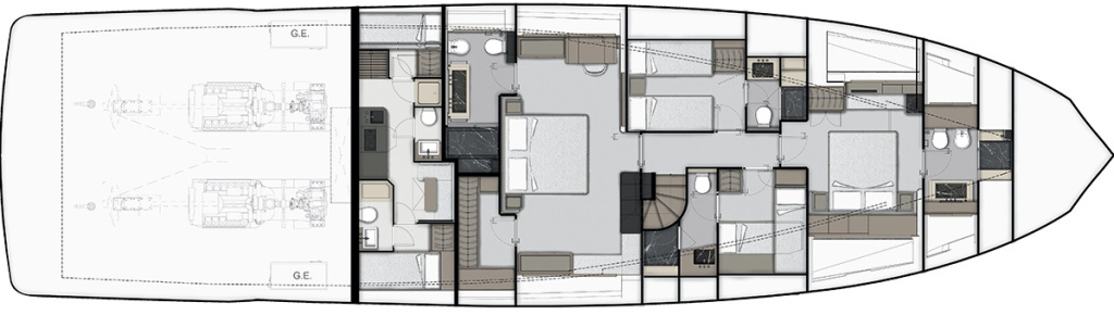 Below deck, the Ferretti Infynito 90 has four cabins, including a full-beam master cabin, VIP forward cabin and two twins. Each cabin has its own bathroom. A dedicated crew area with separate access ensures operational independence and privacy for owners and guests.
