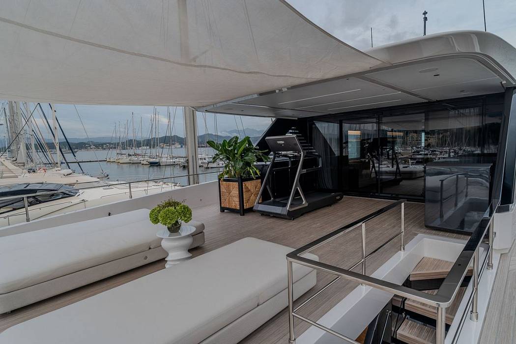 On the upper deck, Ferretti Infynito 90 offers both open-air and enclosed areas: the aft section provides sunbathing space, while the enclosed lounge functions as a secondary salon. This area is equipped with a sofa, a television, and a second helm station.