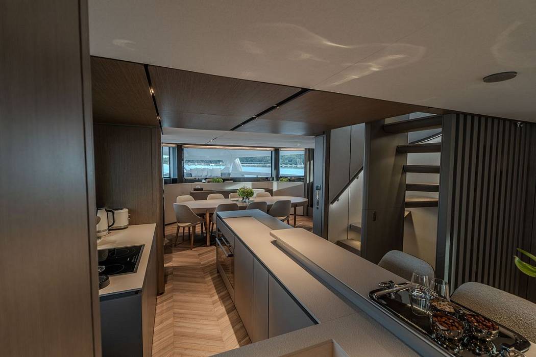 The galley is arranged in an open-plan format with the dining area, with direct access to the All-Season Terrace, a sheltered outdoor area usable in varying weather conditions. This unique terrace is equipped with a lounge area featuring a wide cushioned sunbed with backrest pillows, protected by overhead glazing and framed by side openings for natural airflow. The window can be lowered to seamlessly connect the terrace with the dining area.