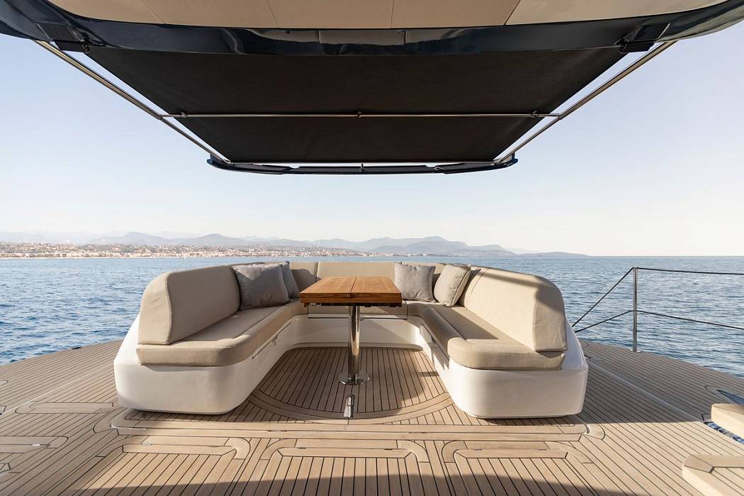 - Expansive flybridge with grill, U-sofa, and helm