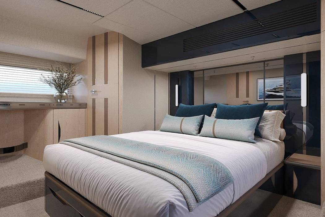 Below deck, the Galeon 520 FLY accommodates up to six guests across three cabins. The full-beam master suite has a private entrance and ensuite, complemented by a forward VIP cabin and a versatile third guest cabin with a sliding bed system that converts between double and twin. An optional skipper’s cabin adds flexibility for longer cruising.