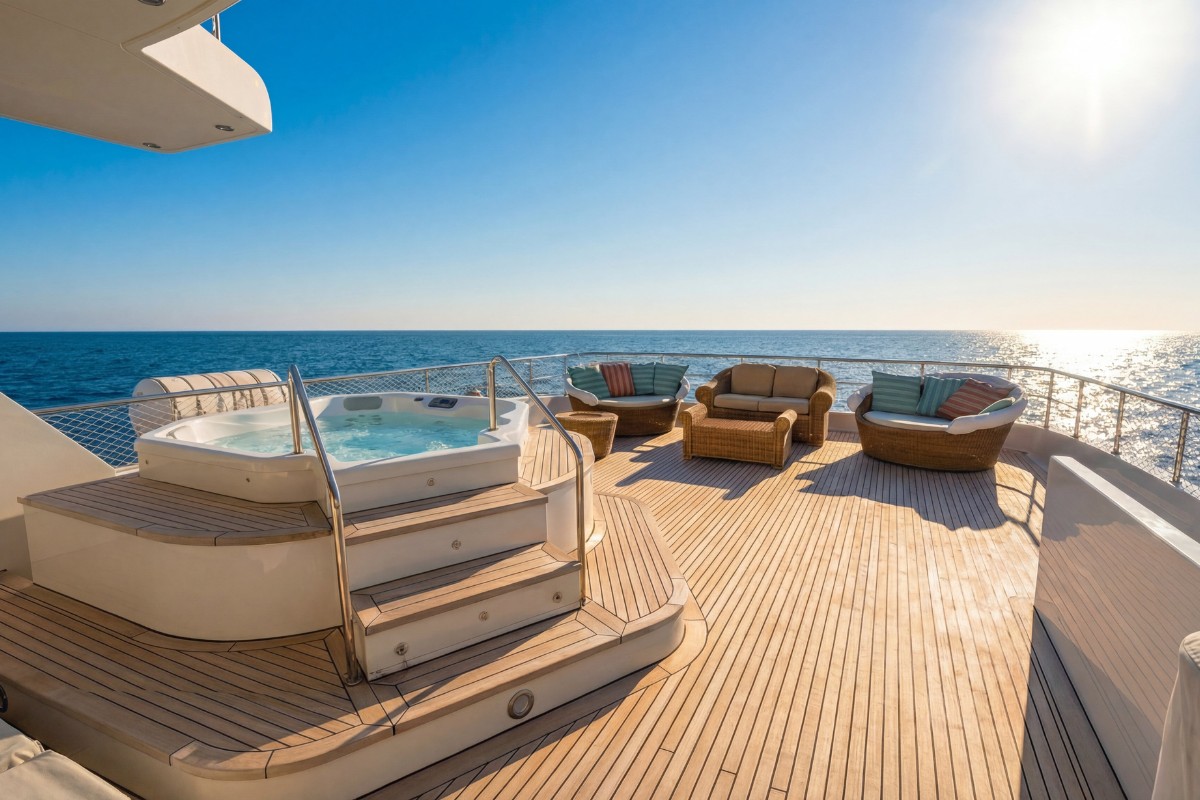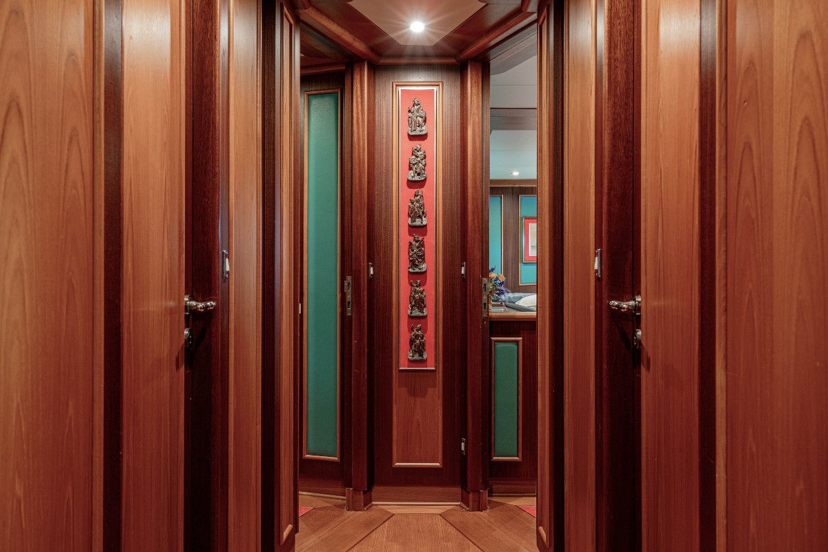 Her exterior lines were drawn by Vincenzo Ruggiero, with outdoor areas arranged across three decks. These include multiple sunbathing sections, a Jacuzzi on the sundeck, generous seating zones and a panoramic sky lounge. The layout supports both private cruising and larger gatherings without compromising circulation between spaces.