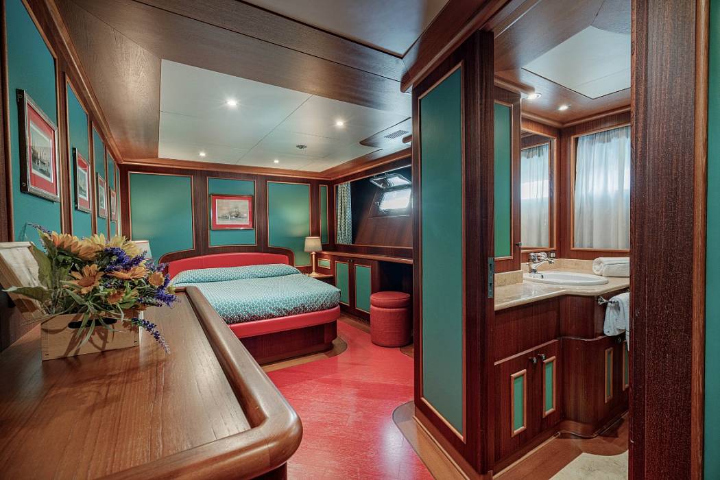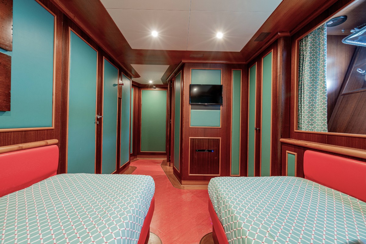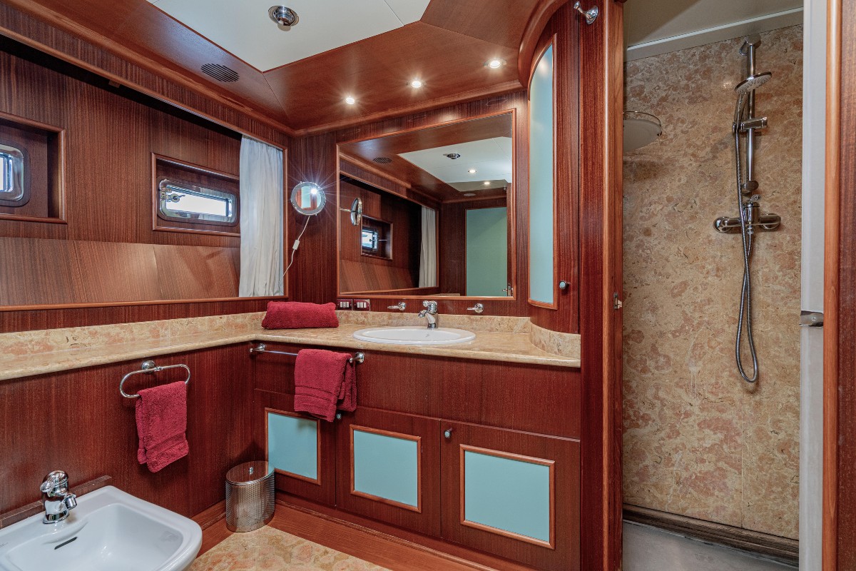 The interior accommodates up to 12 guests in six cabins. New Master features a full-beam master suite on the main deck with a private office, walk-in dressing area and separate his-and-hers bathrooms. Guest accommodation comprises three double cabins with en-suite facilities, plus one twin cabin on the lower deck and one twin cabin on the upper deck. Five crew cabins allow for professional onboard service.