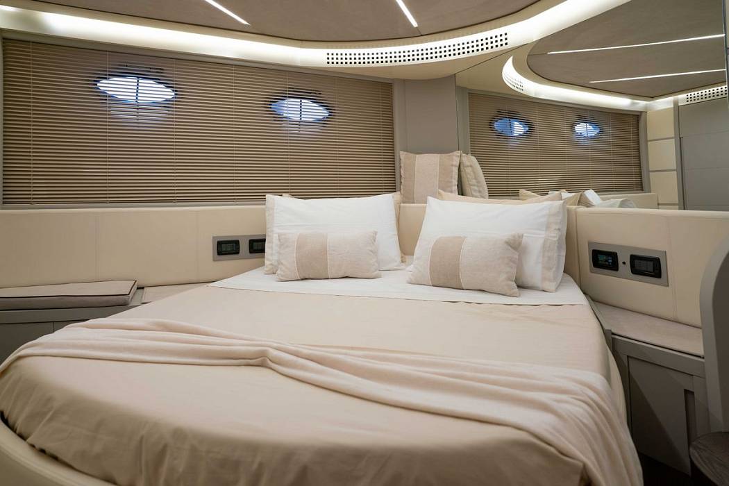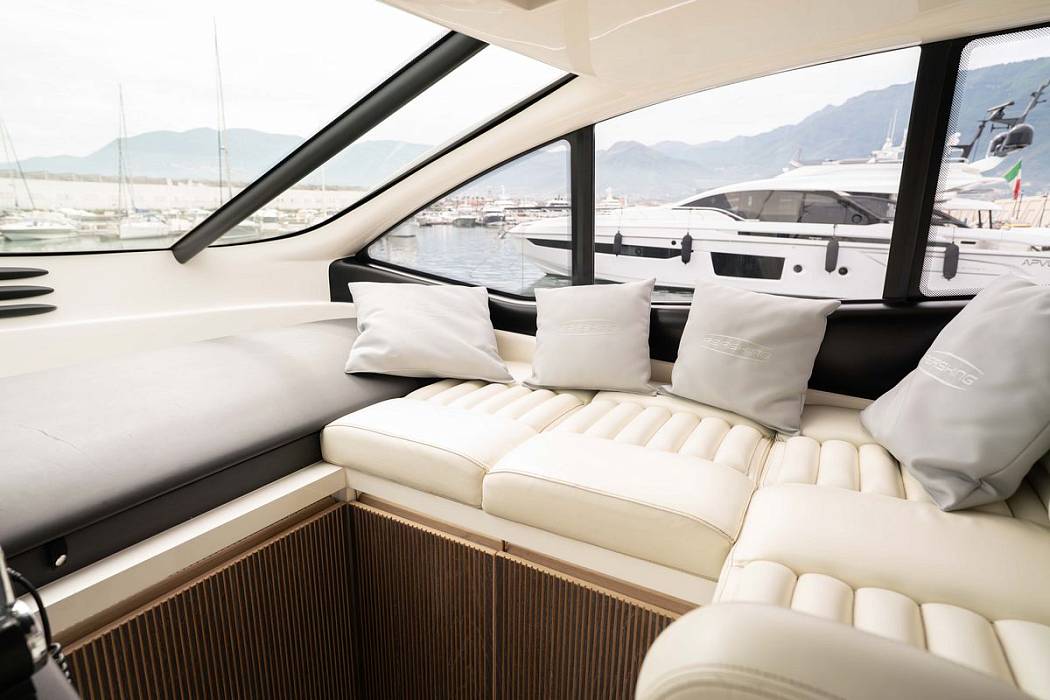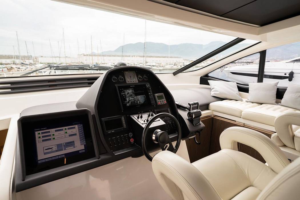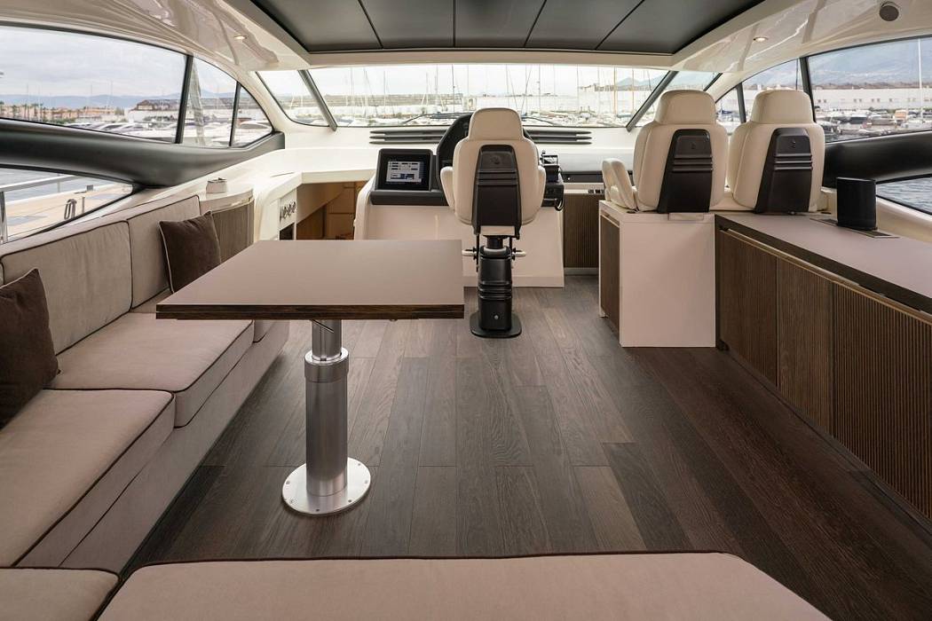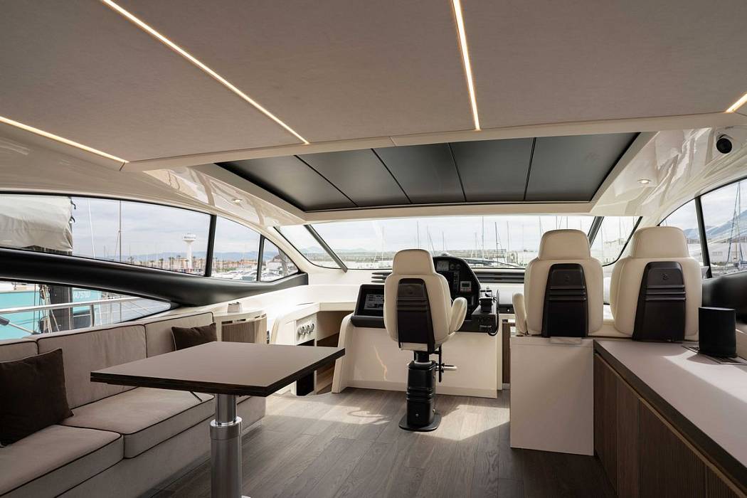 On deck, the Pershing 62 features a sunpad at the stern, a cockpit seating area with dining space, and a helm under a hardtop. Large glass surfaces and an opening roof allow the salon to connect with the outdoors, creating a bright main deck interior. Inside, the Pershing 62 offers a salon with seating, a table, and entertainment space, leading to a lower deck with cabins, galley, and bathrooms for extended stays. The layout is designed for comfort while retaining the brand’s focus on speed and handling.