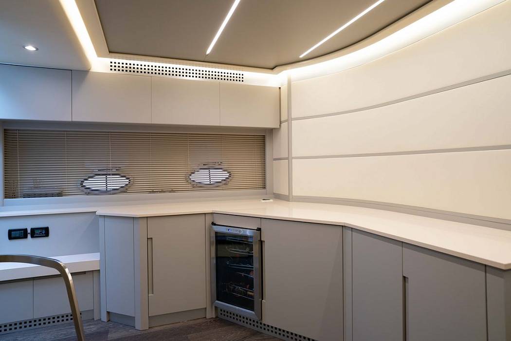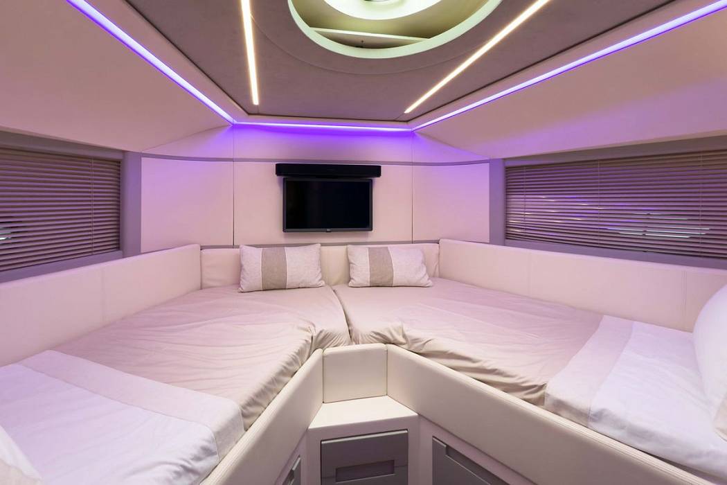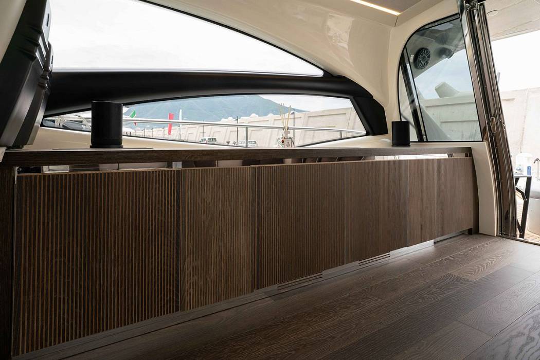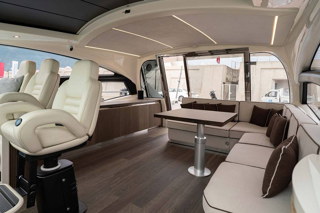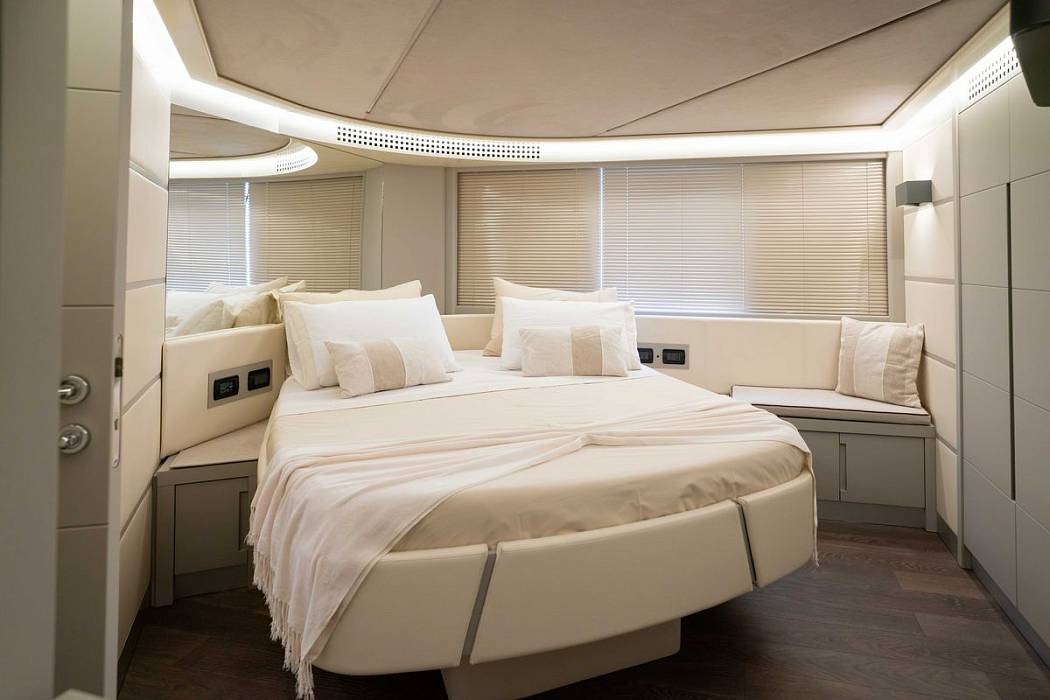 On deck, the Pershing 62 features a sunpad at the stern, a cockpit seating area with dining space, and a helm under a hardtop. Large glass surfaces and an opening roof allow the salon to connect with the outdoors, creating a bright main deck interior. Inside, the Pershing 62 offers a salon with seating, a table, and entertainment space, leading to a lower deck with cabins, galley, and bathrooms for extended stays. The layout is designed for comfort while retaining the brand’s focus on speed and handling.
