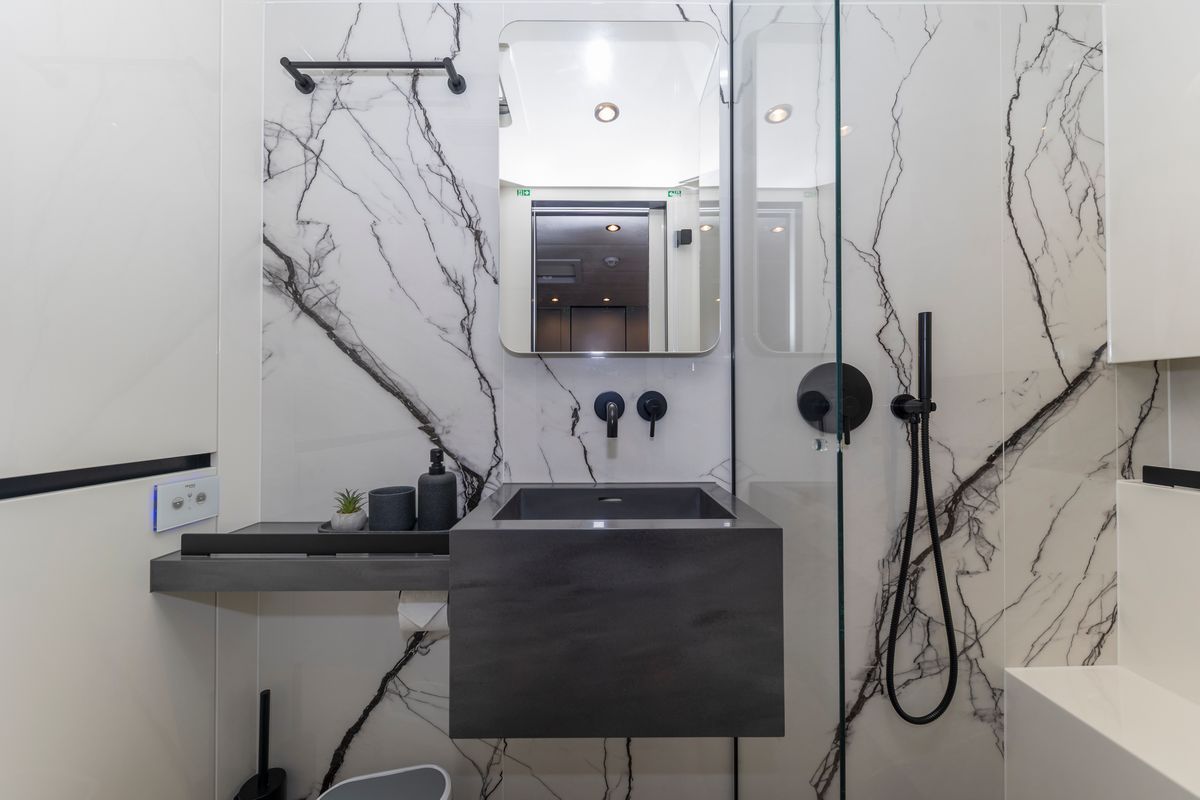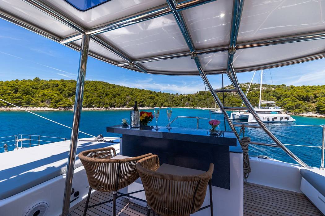 Delivered in December 2023, the Sunreef 60 Mr.Si is presented in near-new condition with continuous care from a dedicated three-person crew. The Sunreef 60 Mr.Si offers over 230 square metres of usable space, with a layout focused on volume, circulation, and separation between guest and crew areas. The Sunreef 60 Mr.Si uses a galley-down configuration, keeping the main deck fully available for social areas and reducing service traffic around guests.The Sunreef 60 Mr.Si accommodates four guest cabins, each fitted with en-suite bathrooms, independent air-conditioning systems, and individual controls. A separate crew cabin ensures operational privacy. Inside, the Sunreef 60 Mr.Si features a fully custom interior with dark finishes and gold-toned detailing, built from selected materials and tailored elements rather than standard production options.
