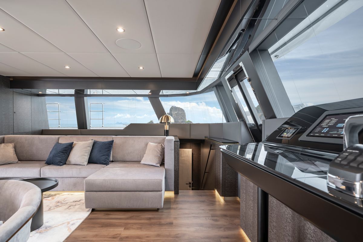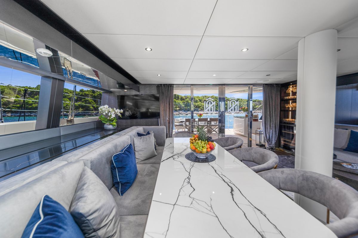 The main saloon on the Sunreef 60 Mr.Si is defined by large vertical glazing, bringing in consistent natural light and open sightlines. Sliding glass doors connect directly to the cockpit, creating a continuous indoor-outdoor flow.
