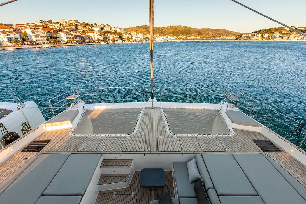 Externally, the Sunreef 60 Mr.Si includes a large flybridge with multiple seating and dining zones, an aft cockpit configured for outdoor meals, and a forward terrace arranged for lounging. A hydraulic swim platform lowers to water level for easy sea access. The foredeck can be used as a quiet zone, including space for hammocks positioned above the waterline.
