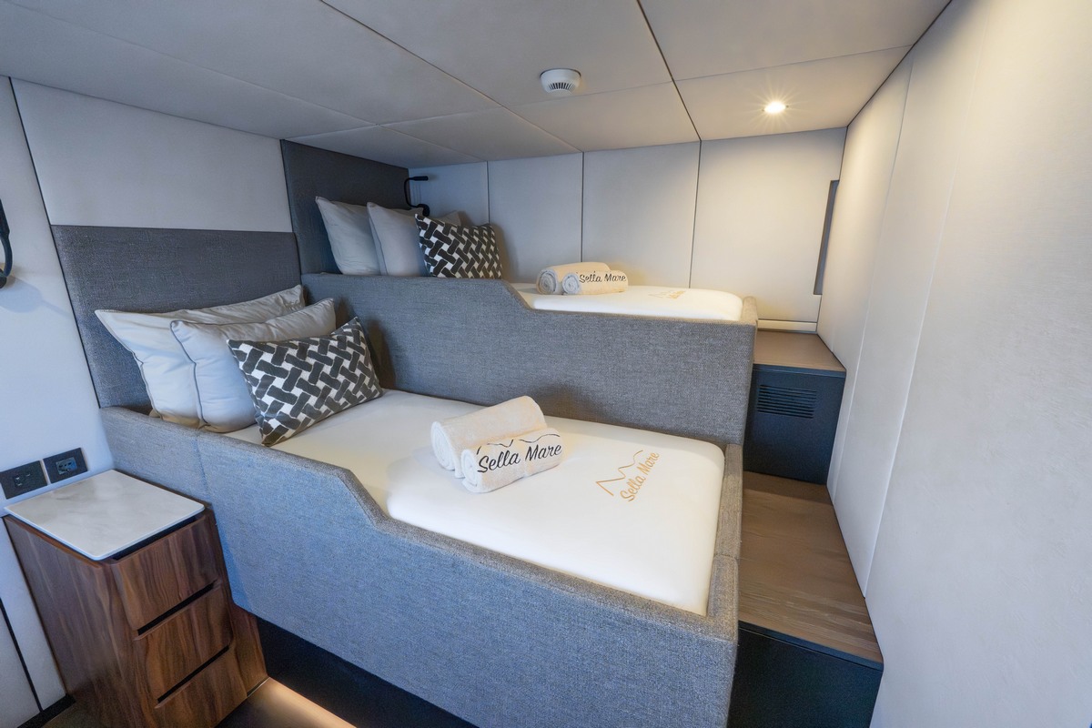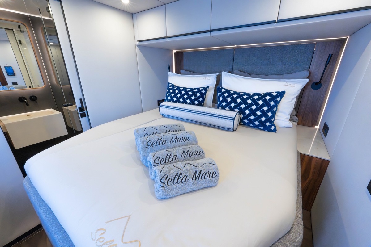 Sunreef 60 Sailing Sella Mare is a 2025 sailing catamaran delivered at the end of the year and currently presented in turn-key condition. Registered under the Malta flag, the 18.40m Sunreef 60 Sailing Sella Mare is fully equipped for immediate cruising with no waiting time or build period.The Sunreef 60 Sailing Sella Mare features a custom configuration not found on other units of this model. Her layout includes a master cabin, three guest cabins and a crew cabin. Two guest cabins are doubles and one is a twin. The main galley is positioned on the main deck, while an additional crew galley is located in the hull next to the crew cabin. This arrangement separates guest and crew areas and improves privacy on board. Extra insulation has been installed between the galley and the master cabin to further reduce noise transfer.