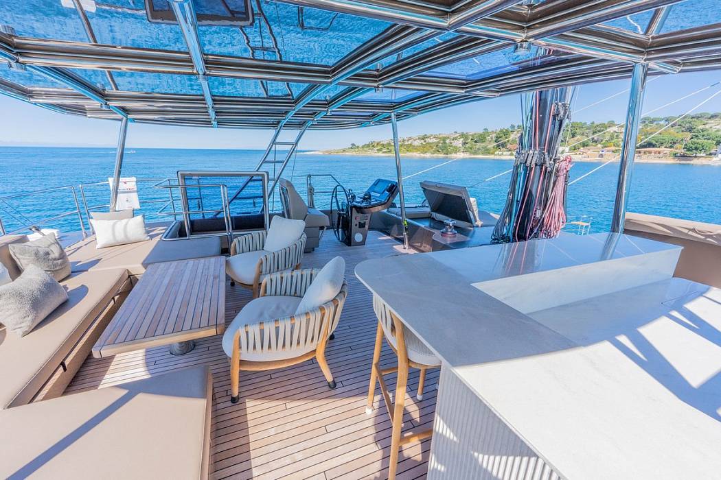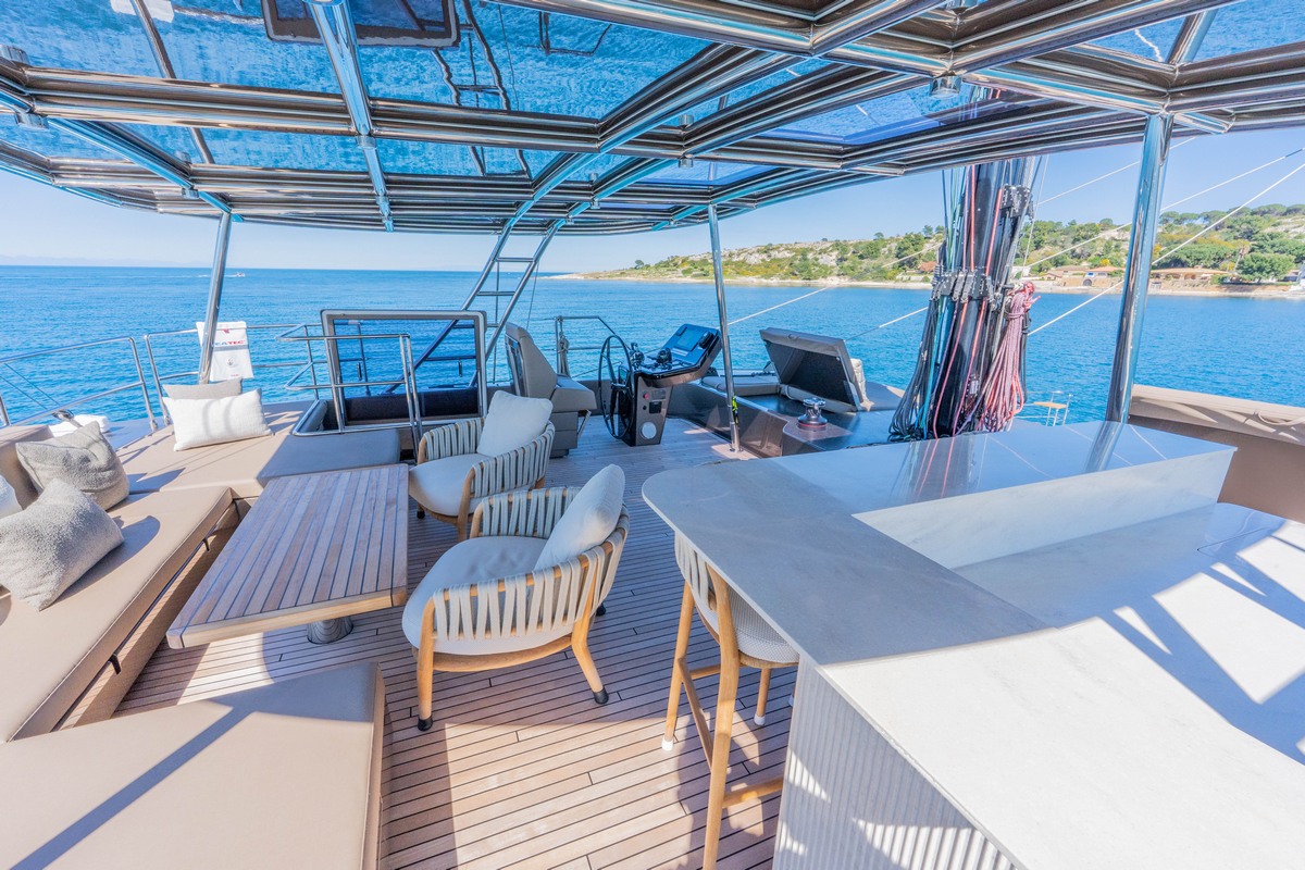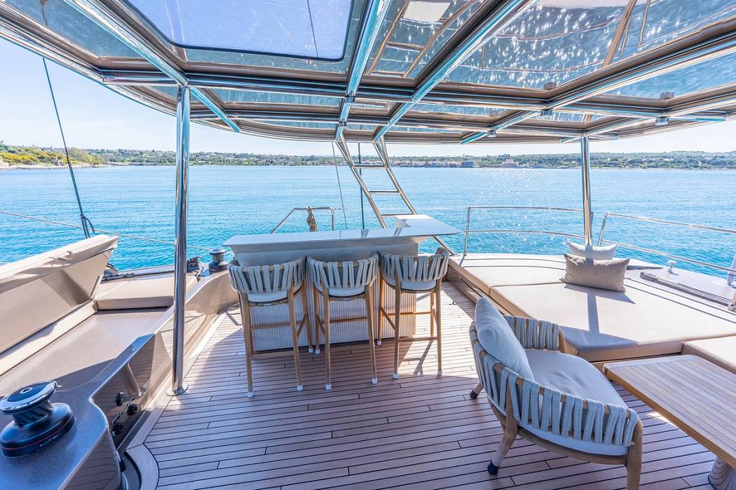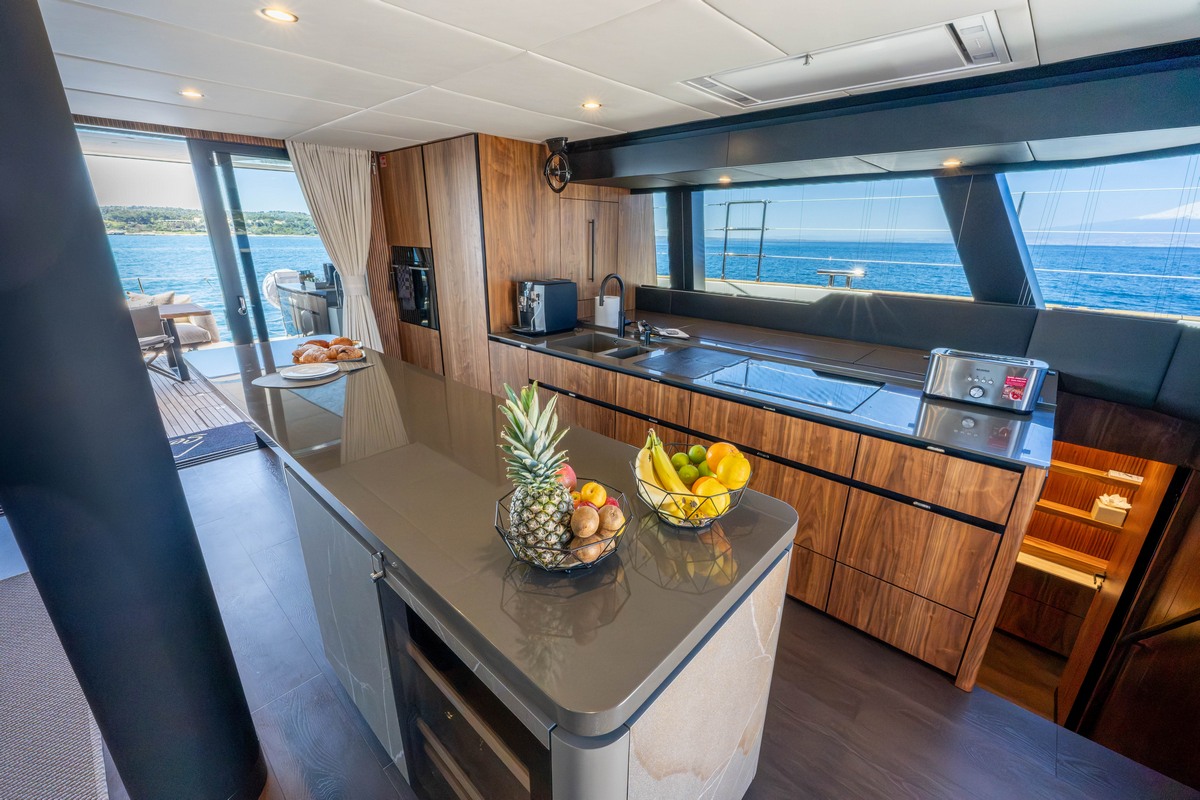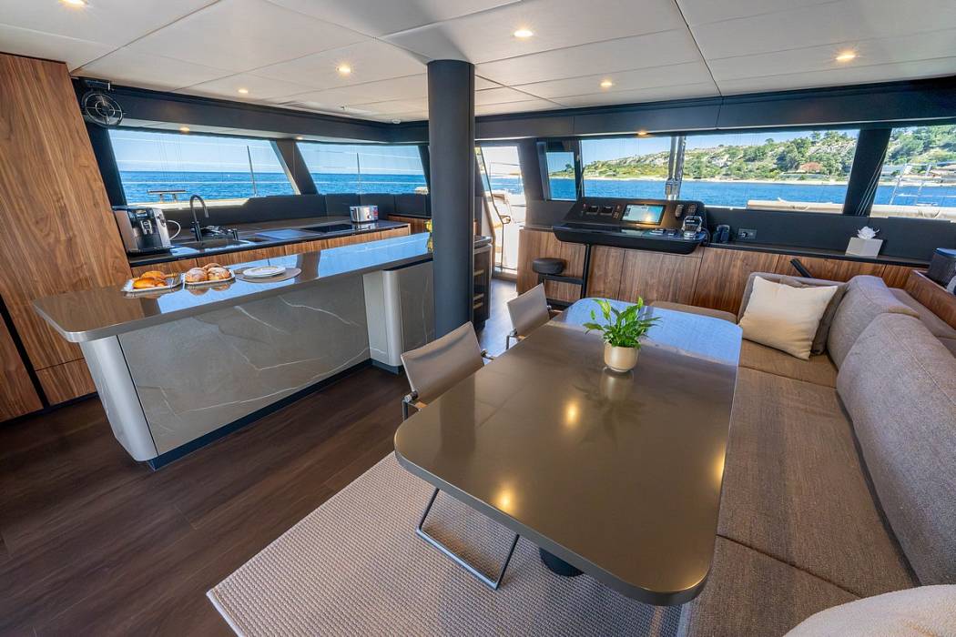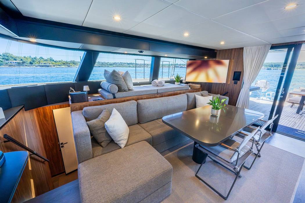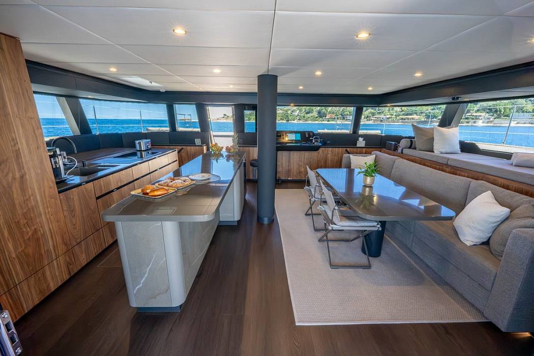 Inside the salon, the Sunreef 60 Sailing Sella Mare is finished in milled American walnut. Additional equipment includes upgraded navigation electronics for Croatia flag requirements, external power sockets, and a composite bimini mounted on stainless supports. The yacht is also delivered with an AG S450C ALU-RIB tender.