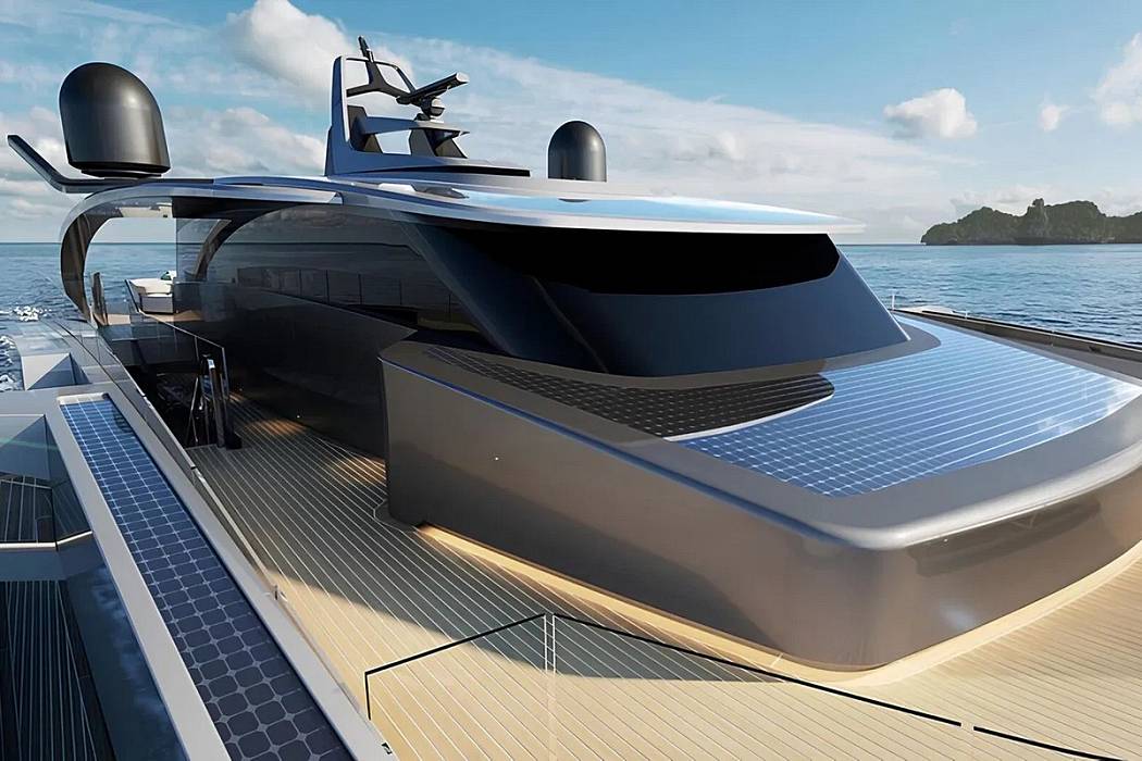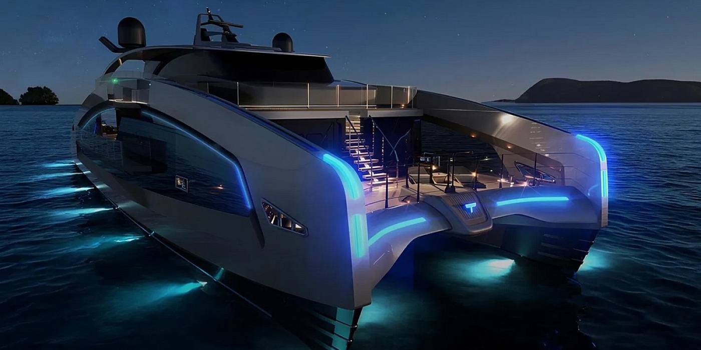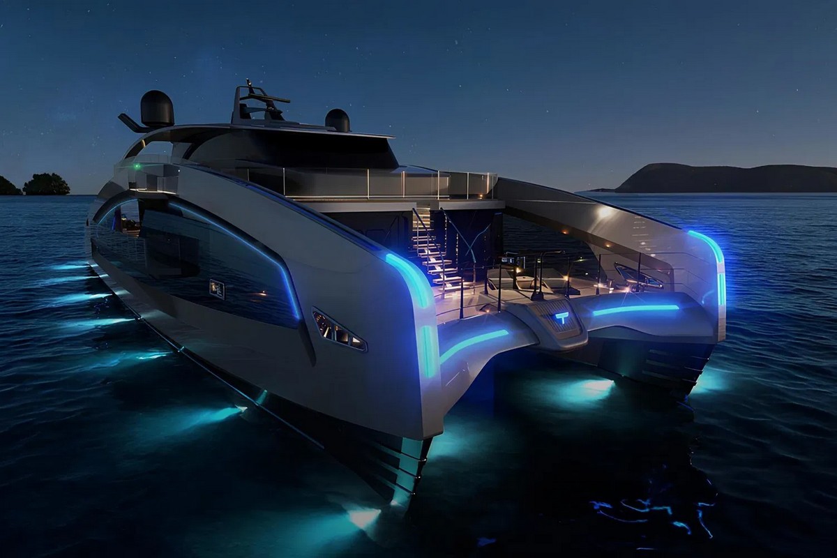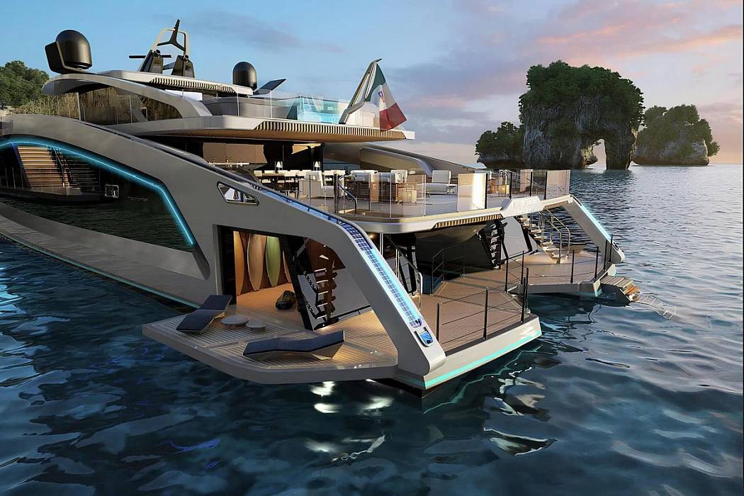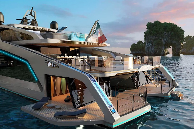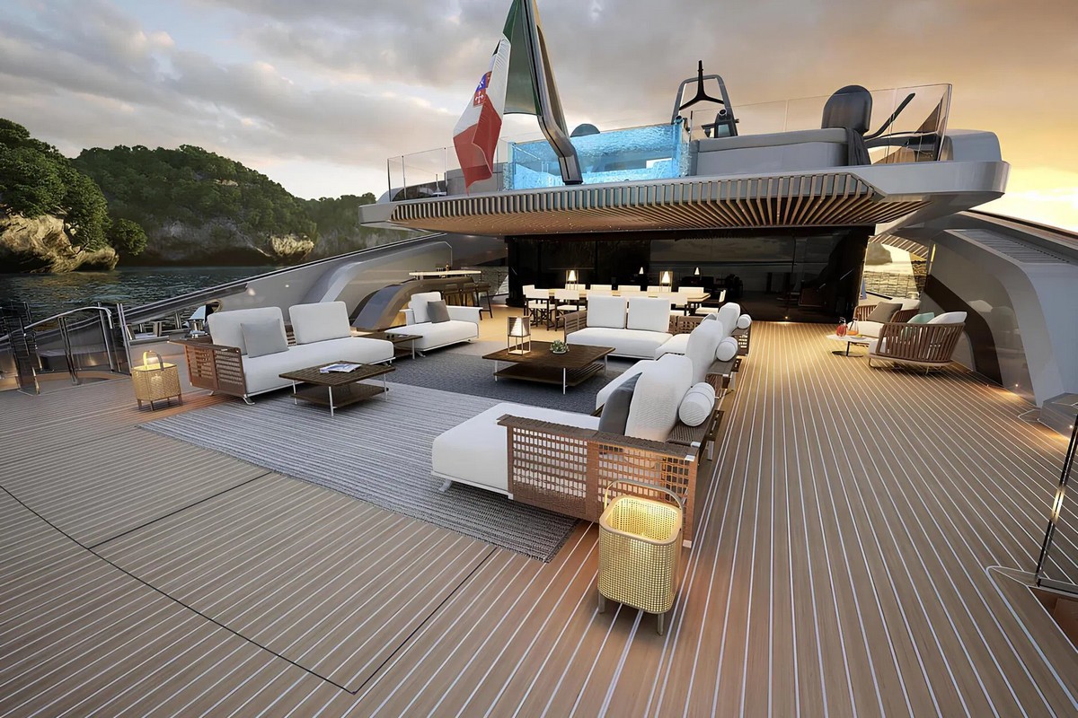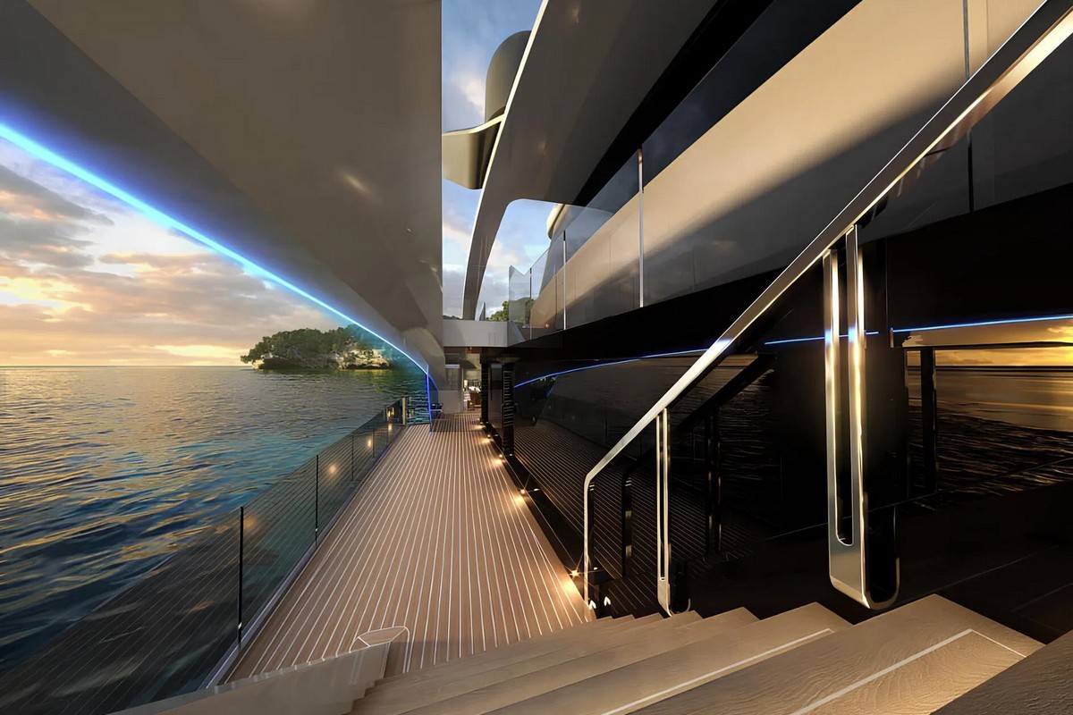The wide beam enables large social areas, panoramic lounges, and adaptable relaxation zones across multiple decks. Signature arches and clean lines form a distinctive, instantly recognisable profile. A key feature is the aft beach club, enhanced by hydraulic side platforms that extend the area to 16 metres, transforming it into a full-scale waterfront terrace for lounging, water activities, and tender operations.