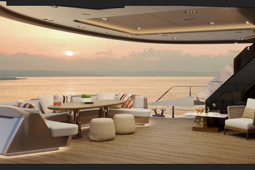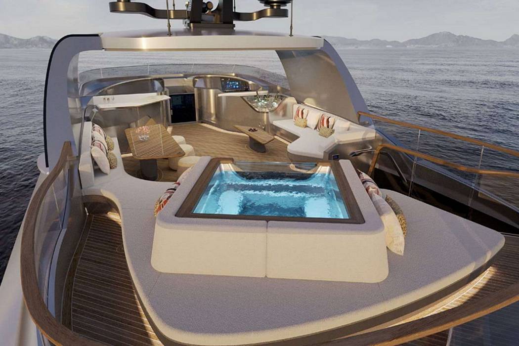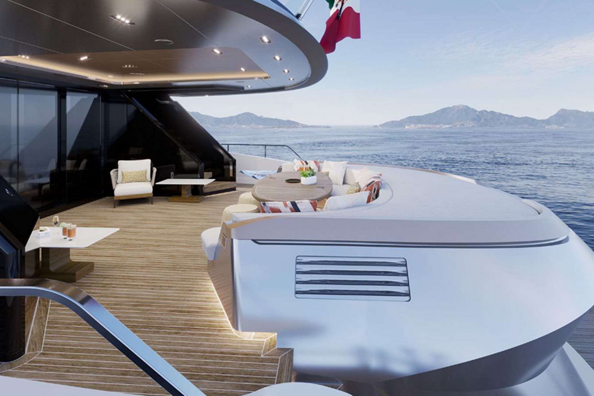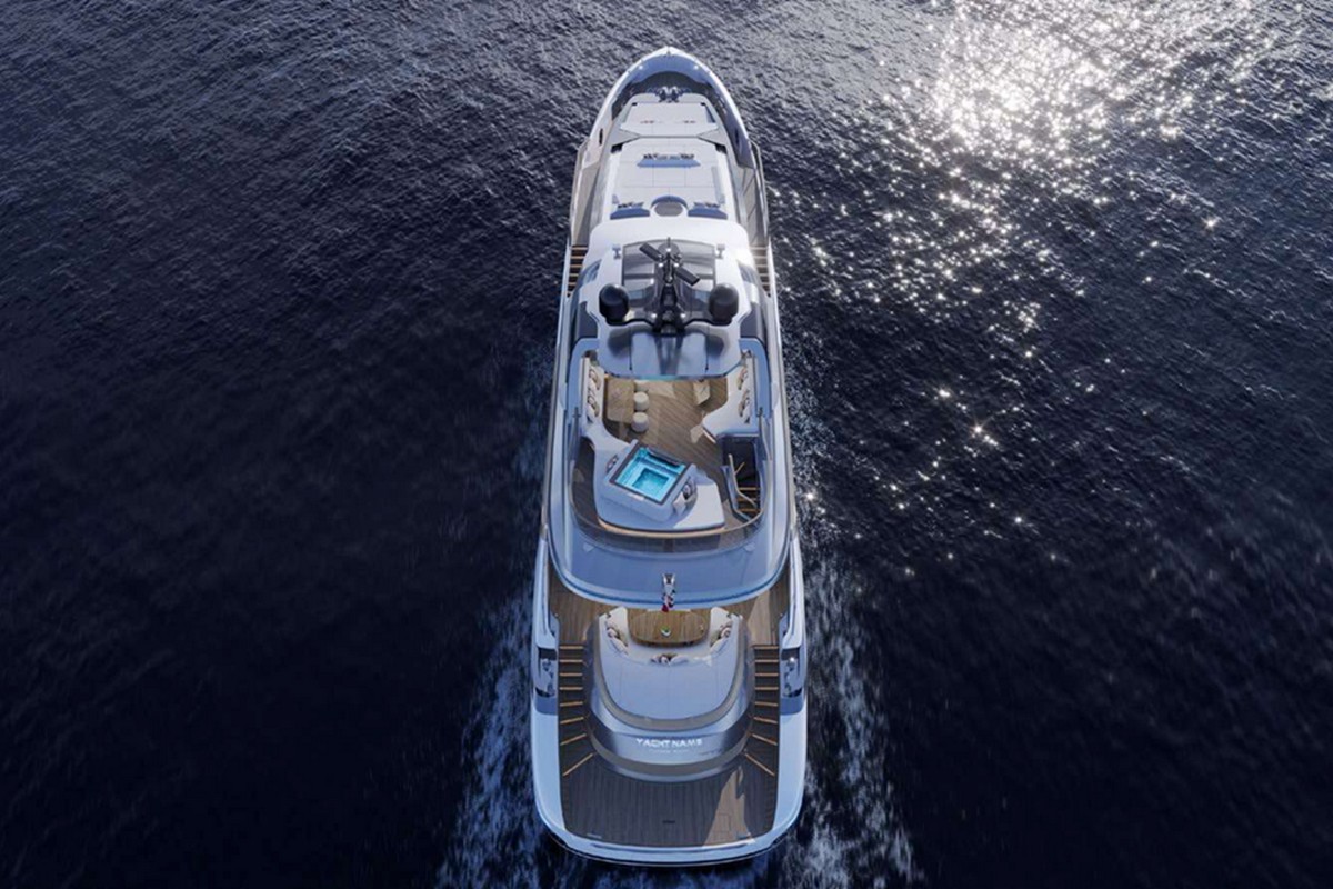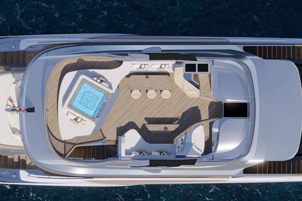 With a gross tonnage of 250 GT and an 8-metre beam, the Tecnomar Evo 120 offers generous interior volume. The main deck features an integrated dining area, lounge, and fully equipped galley. The sundeck is designed for both relaxation and socialising, featuring a partially glazed infinity pool, a bar with an outdoor kitchen, and a wheelhouse positioned at the highest point for optimal visibility.