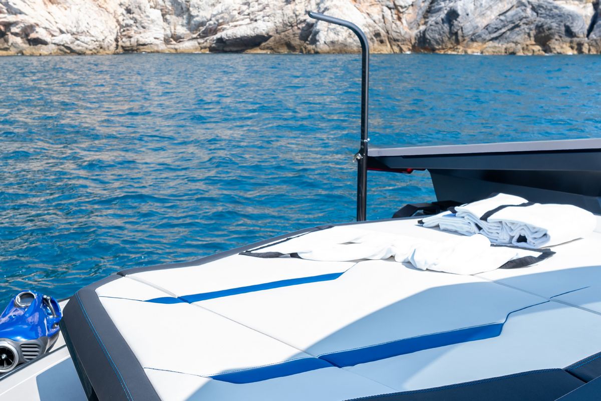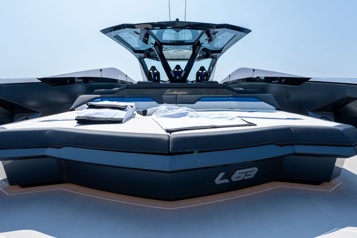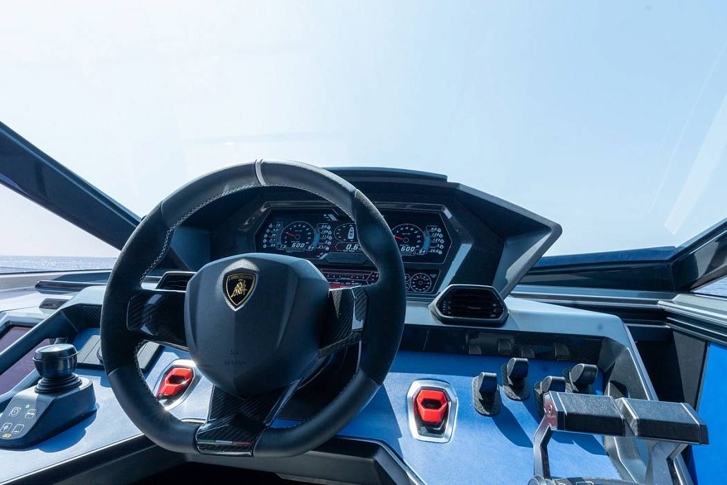 On deck, the Tecnomar for Lamborghini 63 offers defined lounge and sunbathing zones to host guests. The helm carries state-of-the-art electronics and three branded Lamborghini seats, giving the skipper precise, ergonomic control. Instrumentation mirrors distinctive Lamborghini motifs.
