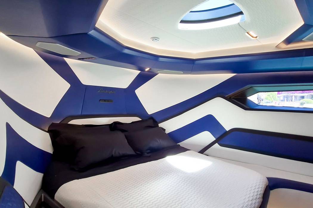 Accommodation is arranged in two independent cabins: a forward master with a king-size berth and a guest cabin that converts between twin singles and a large double. She suits a couple accompanied by family or friends and maximizes available volume with practical storage solutions. Overall, the Tecnomar for Lamborghini 63 aligns performance, design, and usability.
