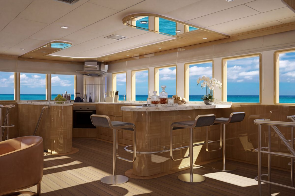 The propulsion package includes twin 750 HP engines, supported by a fuel capacity of 30,000 litres. At a cruising speed of 9 knots, the yacht is expected to achieve a range of approximately 4,500 nautical miles, allowing for long passages without the need for frequent refuelling. An additional feature is the possibility of silent cruising, reducing both noise and vibration on board.