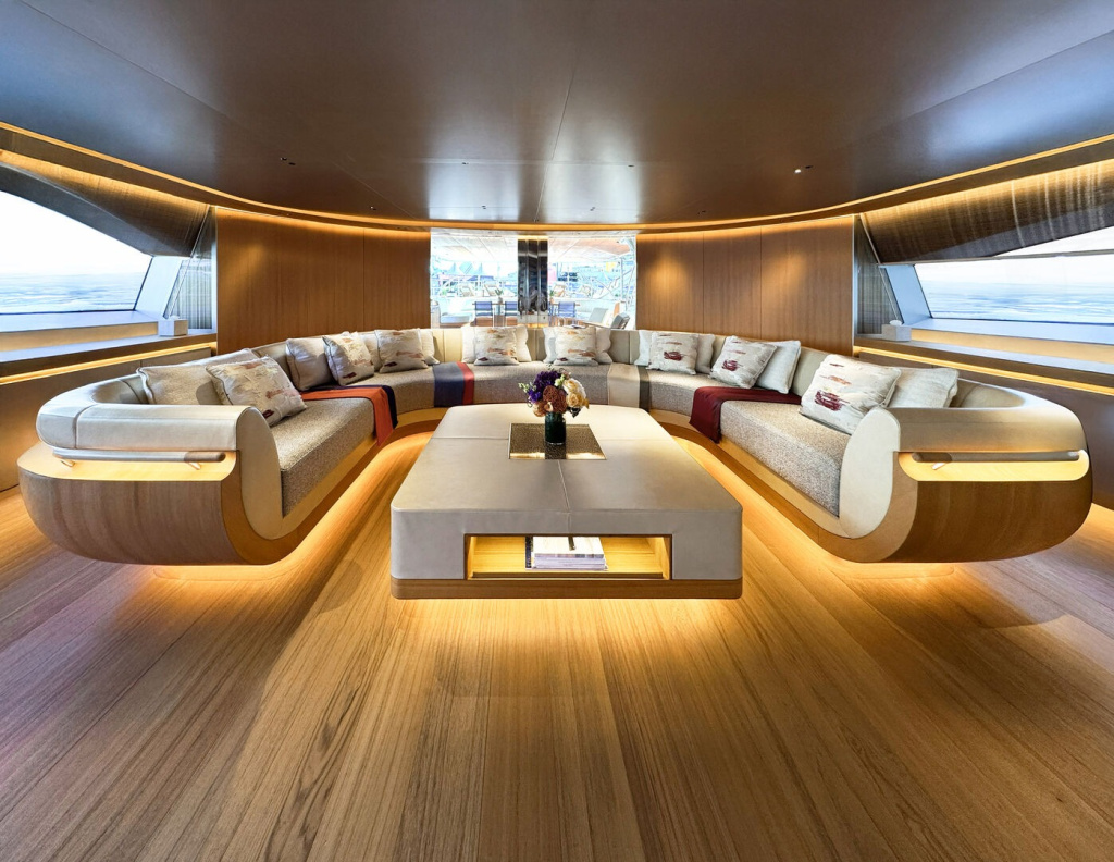Furniture throughout the yacht was designed as integrated pieces rather than standalone objects. Beds, seating, and fixed elements were shaped to appear visually detached from the teak flooring, creating the impression of suspended forms. A recessed tray ceiling was executed with the same approach, visually separated from surrounding structures to reinforce continuity across the interior.