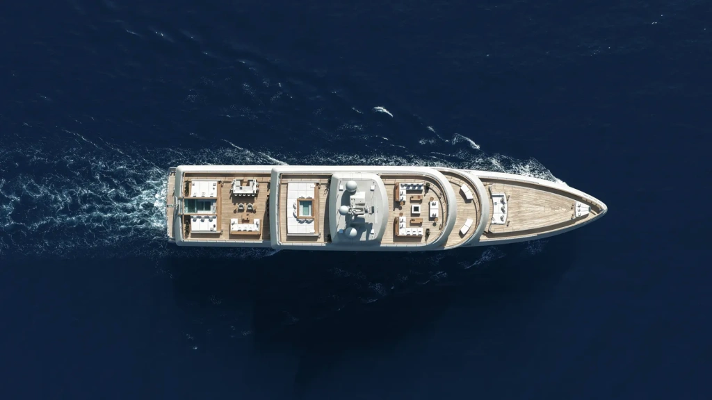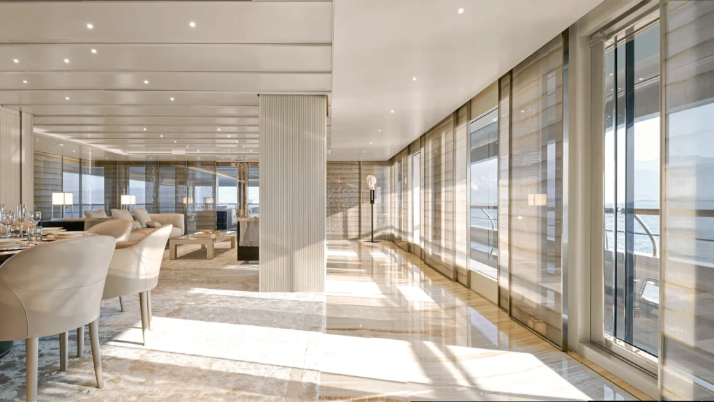 Her exterior avoids excess. A satin-gold profile defines the hull and superstructure, structured around precise geometric volumes softened by curved surfaces. Extensive floor-to-ceiling glazing opens the yacht visually, while the upper deck appears almost suspended, creating a terrace effect that lightens the yacht’s silhouette despite her displacement construction.