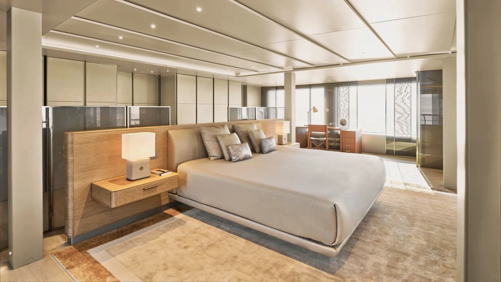 The main saloon serves as the social centre on board and a clear expression of Armani’s design discipline. An ivory onyx floor anchors the space, centred by a custom Armani Casa carpet. Canaletto walnut sofas are paired with coffee tables finished in platinum leaf, while a dining area forward seats 14 on Armani Casa “Lea” chairs. Decorative glass curtains—laminated glass with a metal-mesh core framed in champagne aluminium—were produced by three Italian specialists. A television remains hidden until lowered from the ceiling.