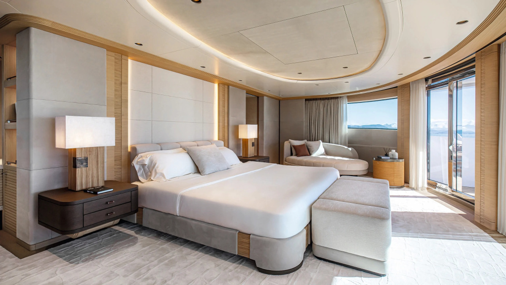 Full-height windows and unfolding balconies erase the separation between hull and horizon. Warm woods, natural leathers, and muted textiles create continuity without repetition. Below, the beach club is designed as a calm retreat rather than a passageway. A compact pool is set into the platform, its rounded outline mirroring the yacht’s exterior curves.