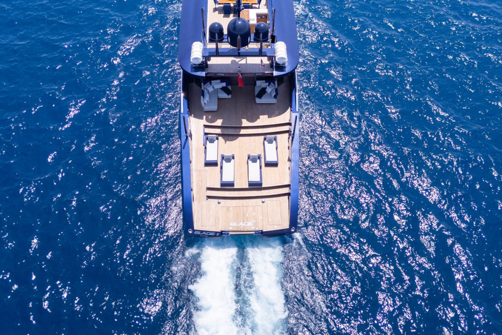 At the stern, BLADE II transforms into a floating terrace. The vast teak aft deck functions as a beach club, with seamless flow between interior and exterior. Deep-cushioned sofas line the transom, while four large sun loungers occupy the centre stage — perfectly aligned with the yacht’s wake.