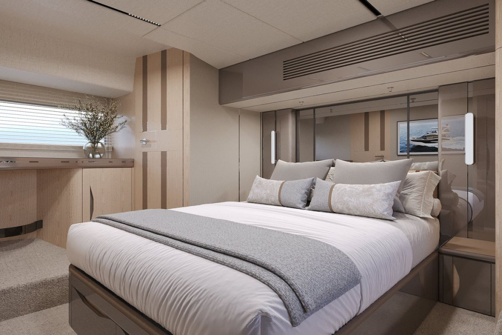 Forward VIP cabin with good storage and natural light, designed as a true second double rather than a “guest afterthought.”