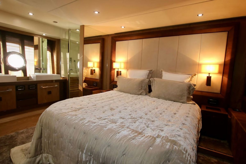 Outdoor areas are arranged for genuine use rather than display. The aft cockpit includes a dining zone where the sofa extends into a large sun-lounger, protected by an electric canopy. Built-in cabinets integrate a drinks refrigerator and icemaker, keeping the cockpit self-sufficient during day cruising or longer afternoons at anchor. A concealed cockpit hatch reveals a secondary docking station, while safe side decks lead forward to a foredeck lounge with additional sunpads.